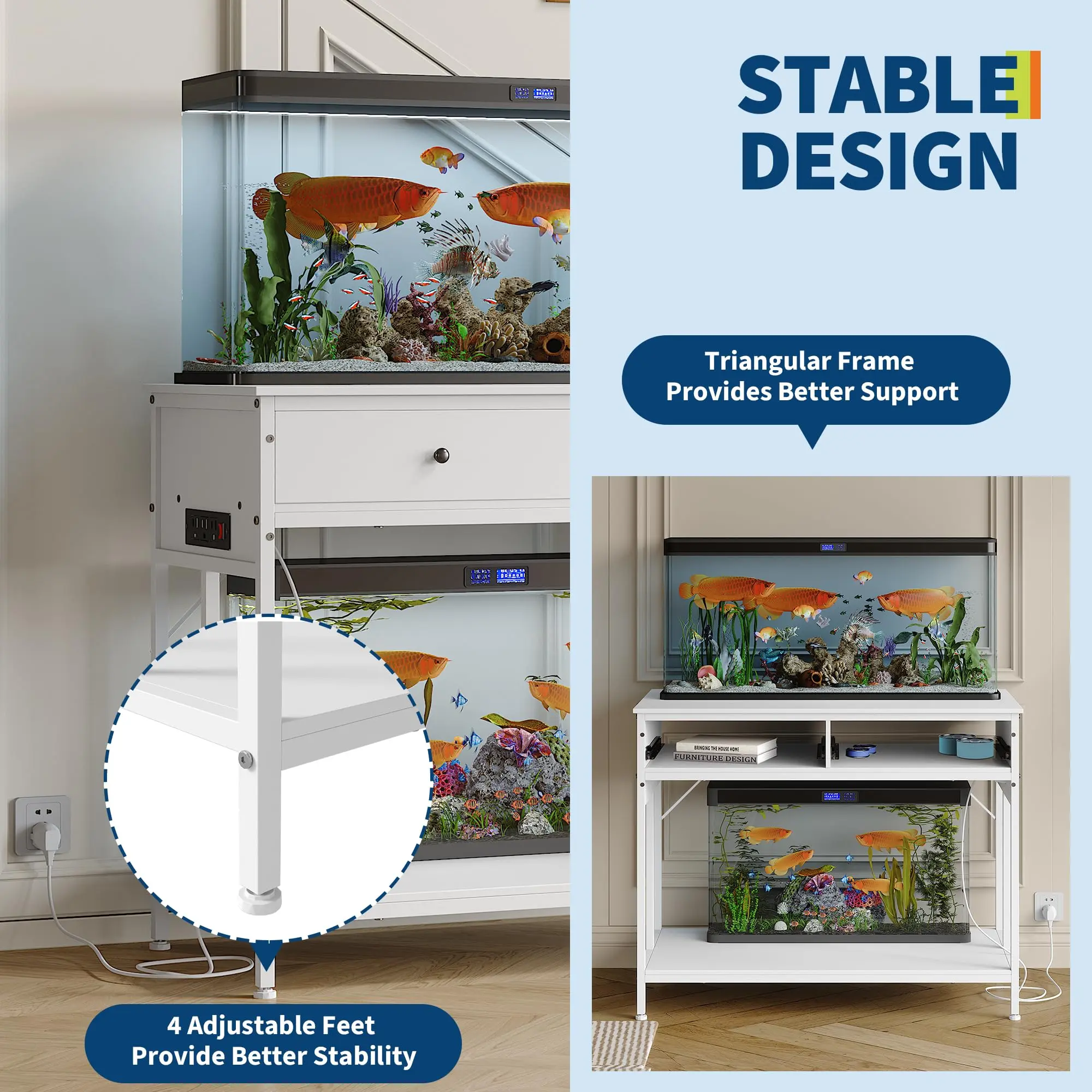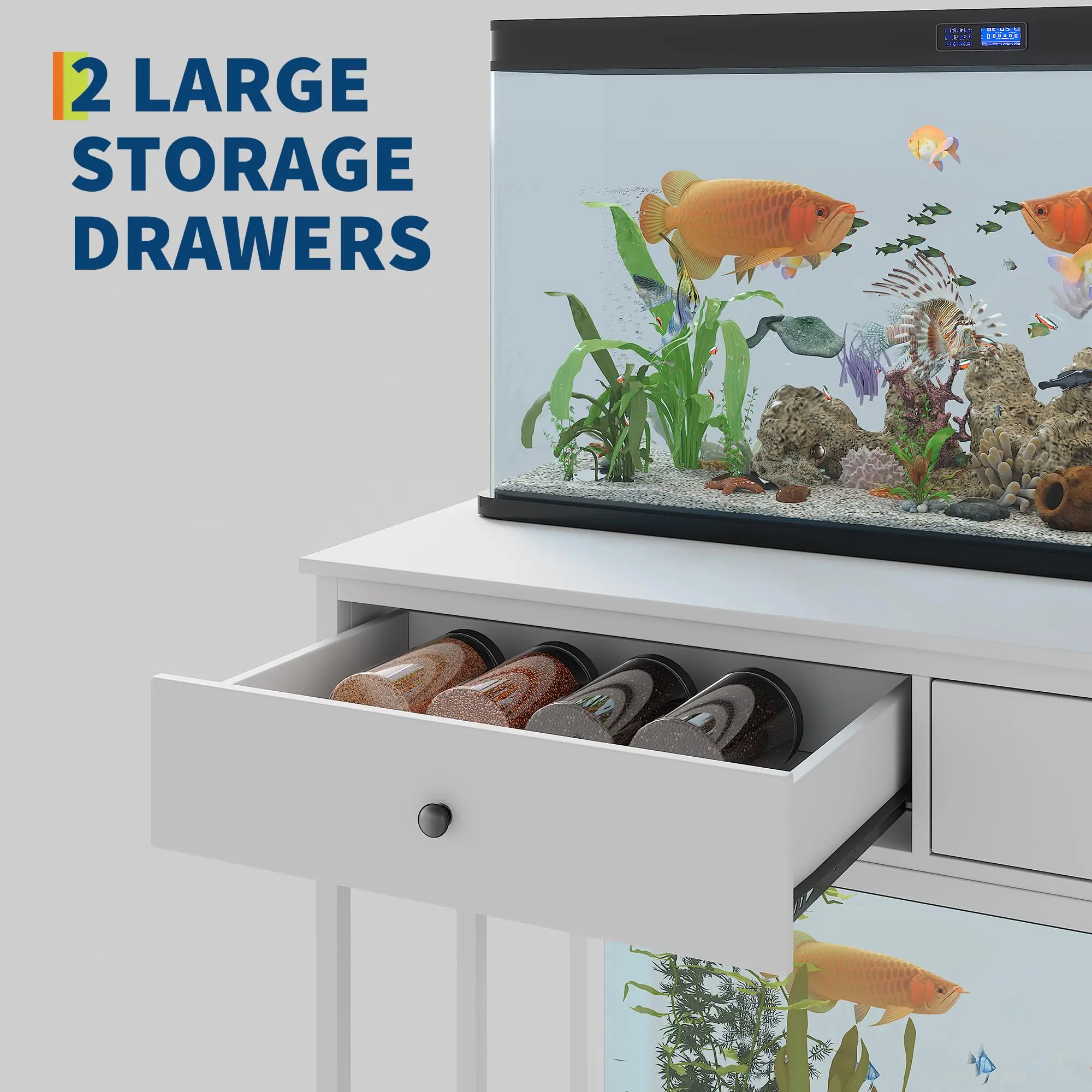 · Ample Storage Space: Our fish tank stand features two drawers for storing fish food, aquarium kits, cleaning tools, and more. The removable drawers offer flexibility, allowing you to adjust the drawers to your storage needs.