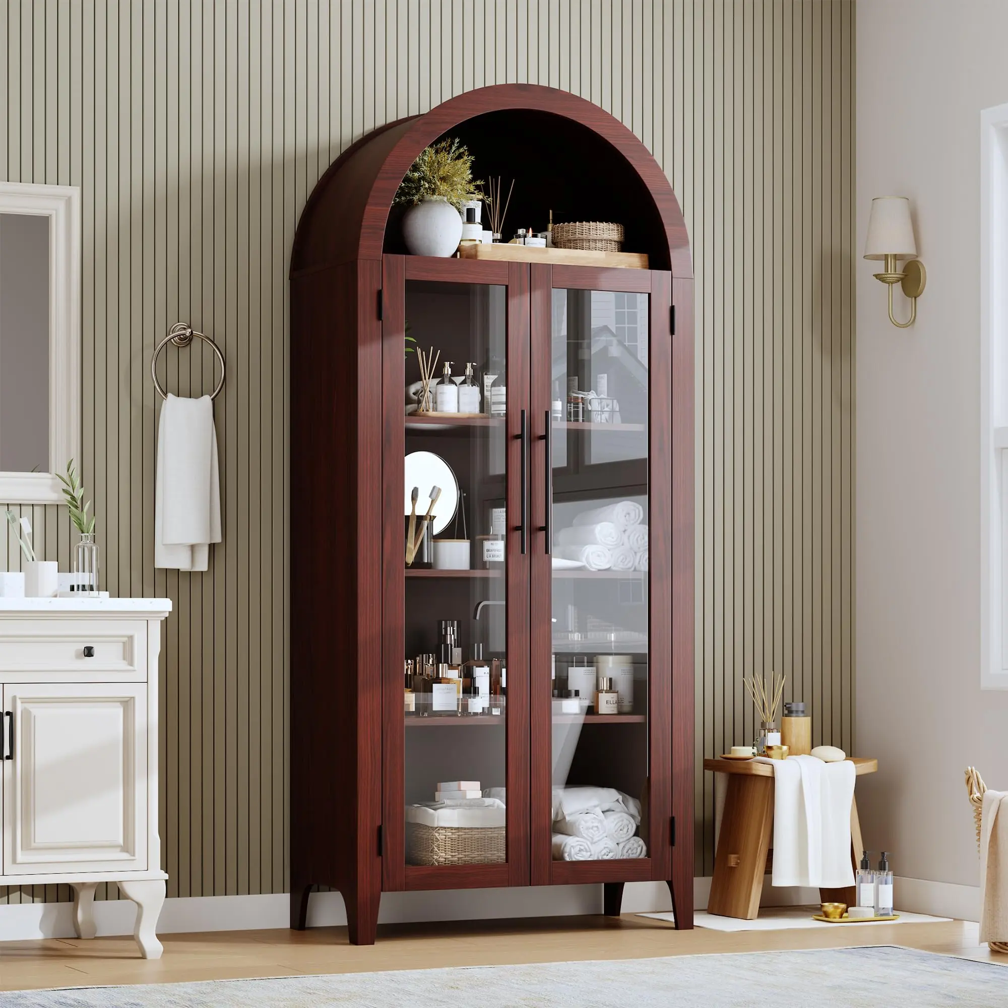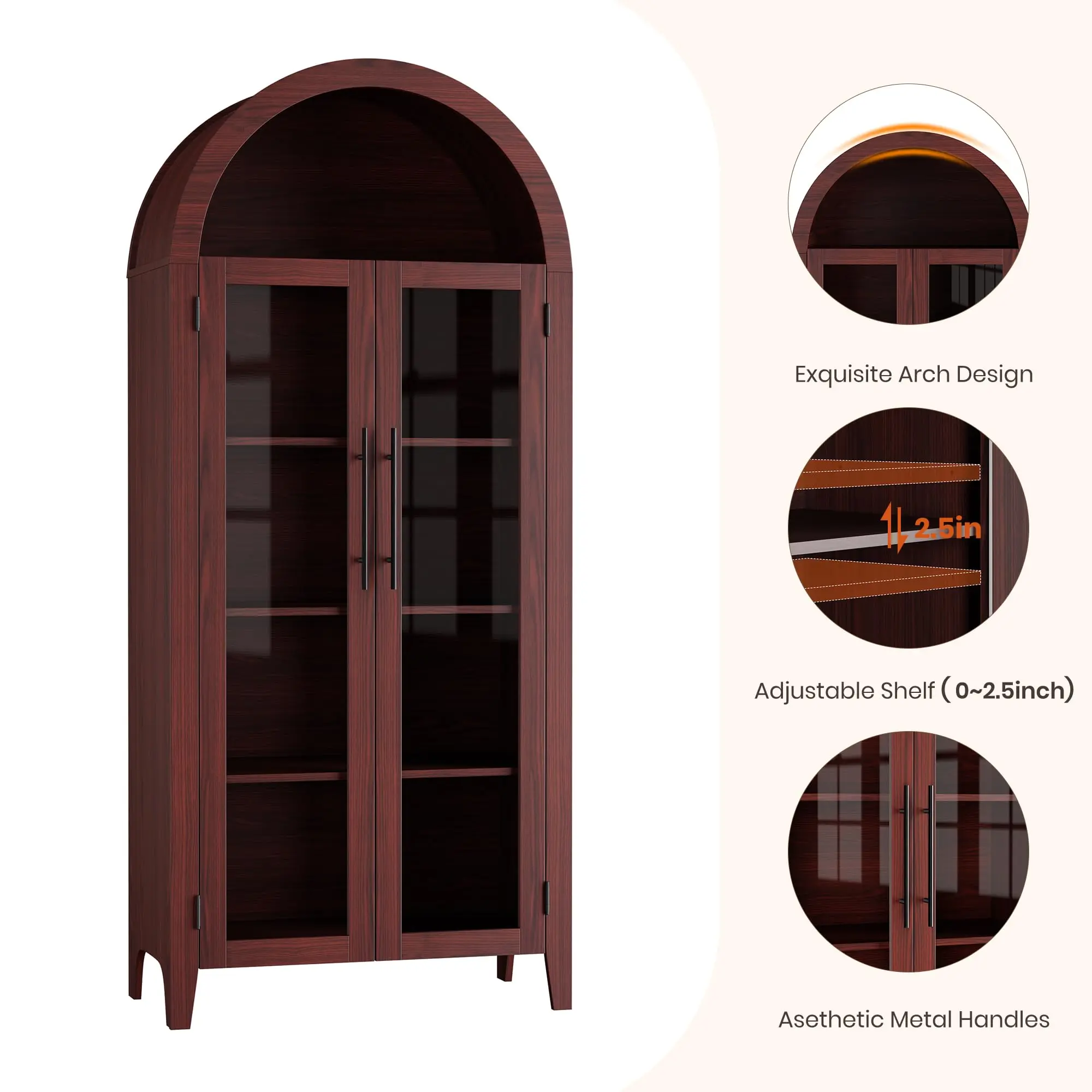 · 【Durable & Reliable Construction】:This arched cabinet is constructed from premium MDF Boards and supported base, which ensure the sturdiness and durability of it. Whats more, the thick and sturdy wooden board can provide strength, making it suitable for both delicate items and heavy things. We also provide anti-tipping kit to ensure your safety
