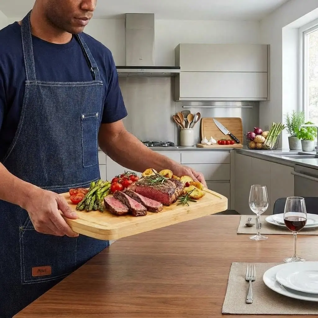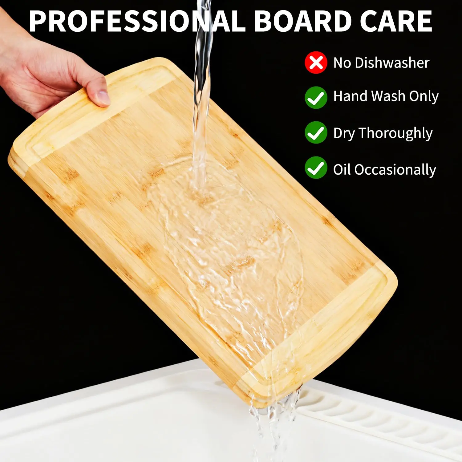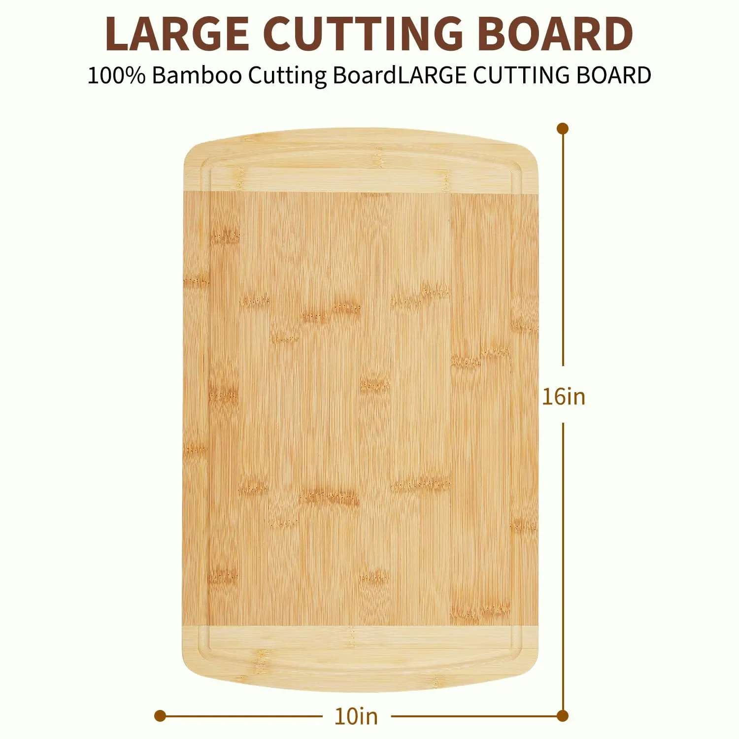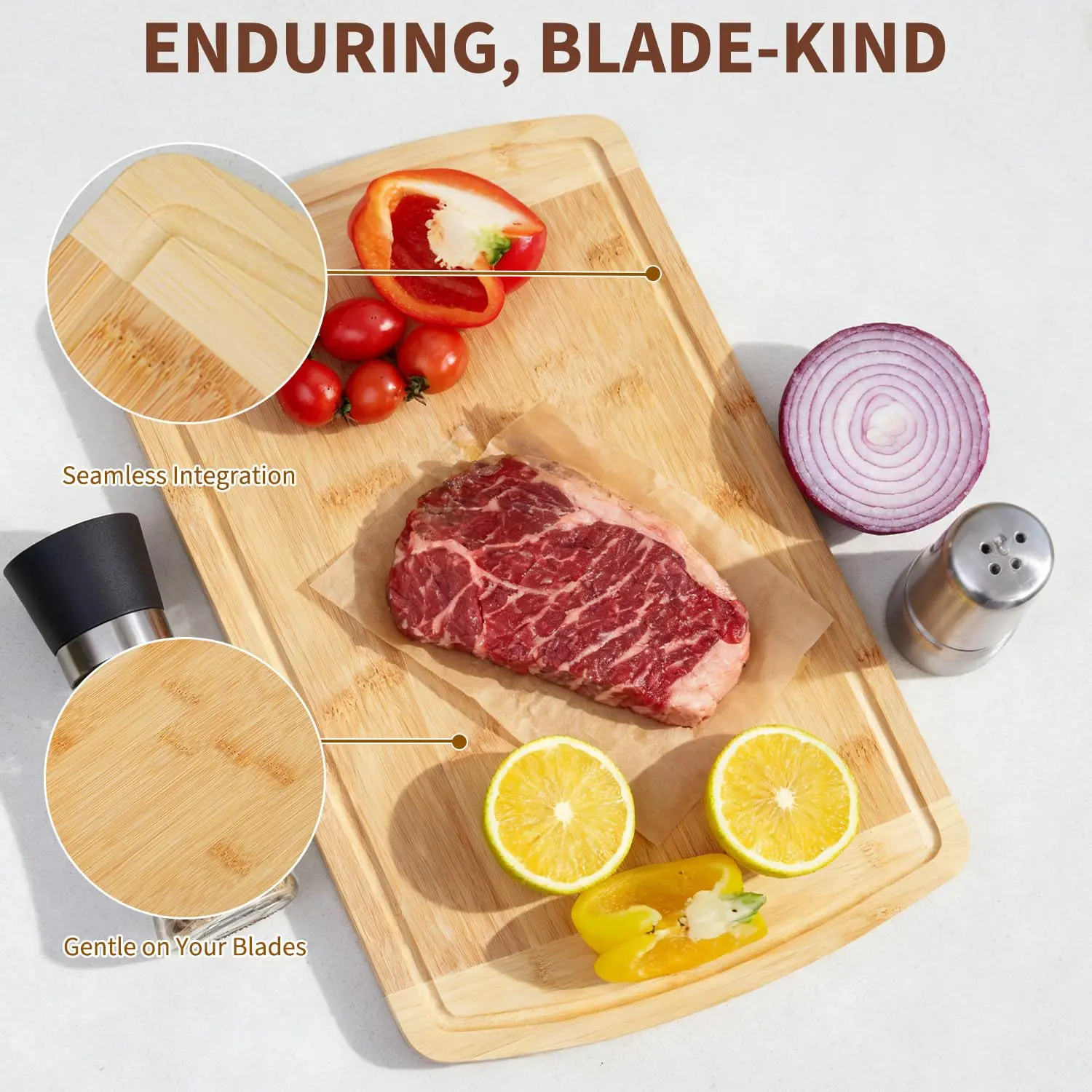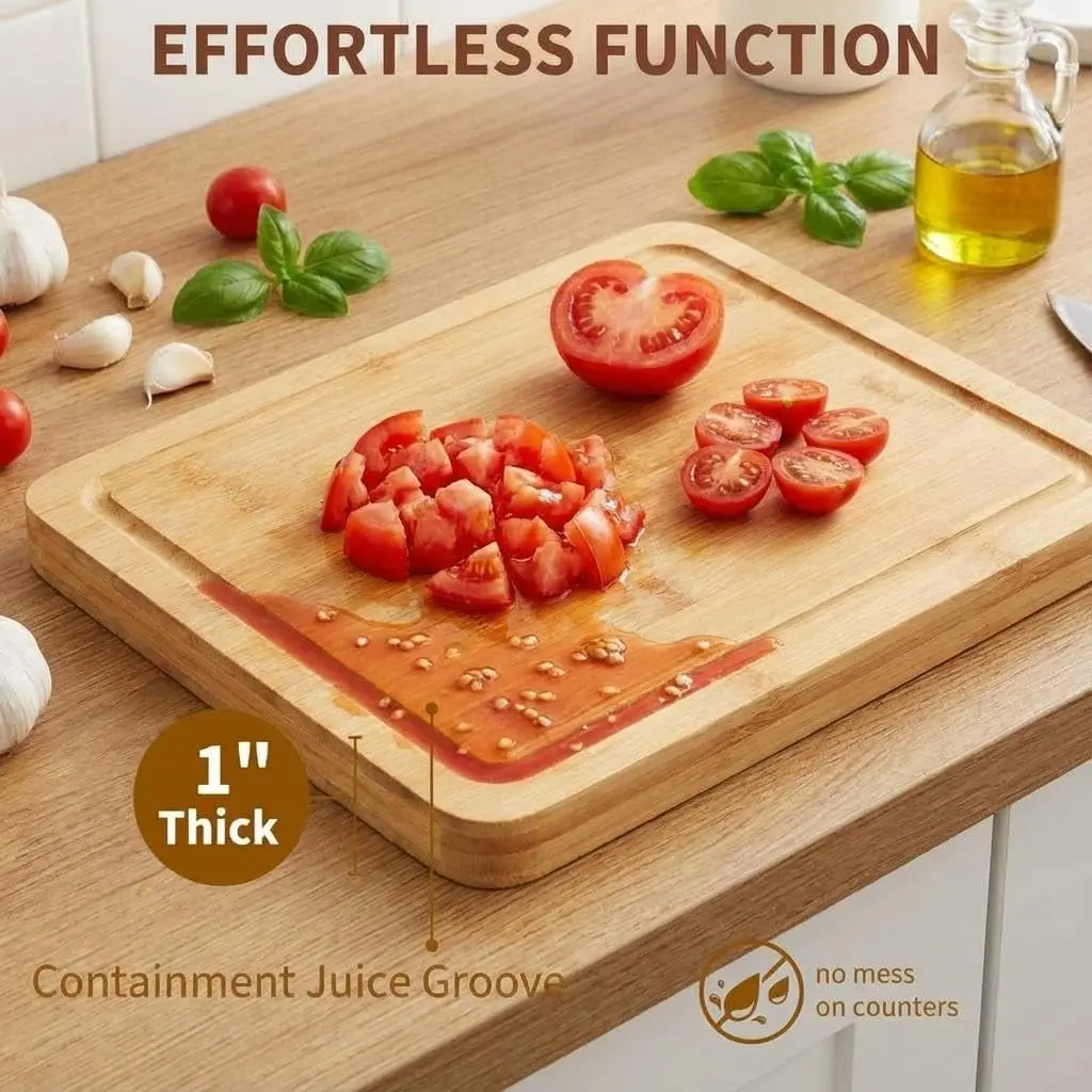· Deep Juice Groove for a Cleaner Experience: Designed with a generous juice groove, this bamboo cutting board catches every drop from juicy fruits or cooked meats. Keep your countertop spotless and reduce cleanup, whether it's daily meals or holiday feasts