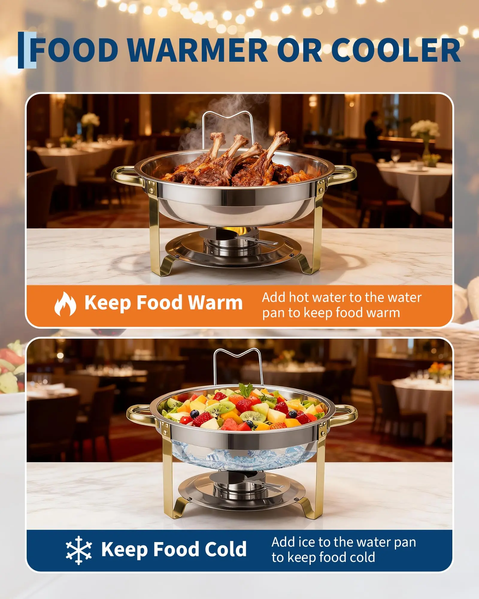 · Dual hot-cold function: keep dishes warm by adding hot water and fuel, or cold with ice, perfect for salads, desserts, or hot dishes.