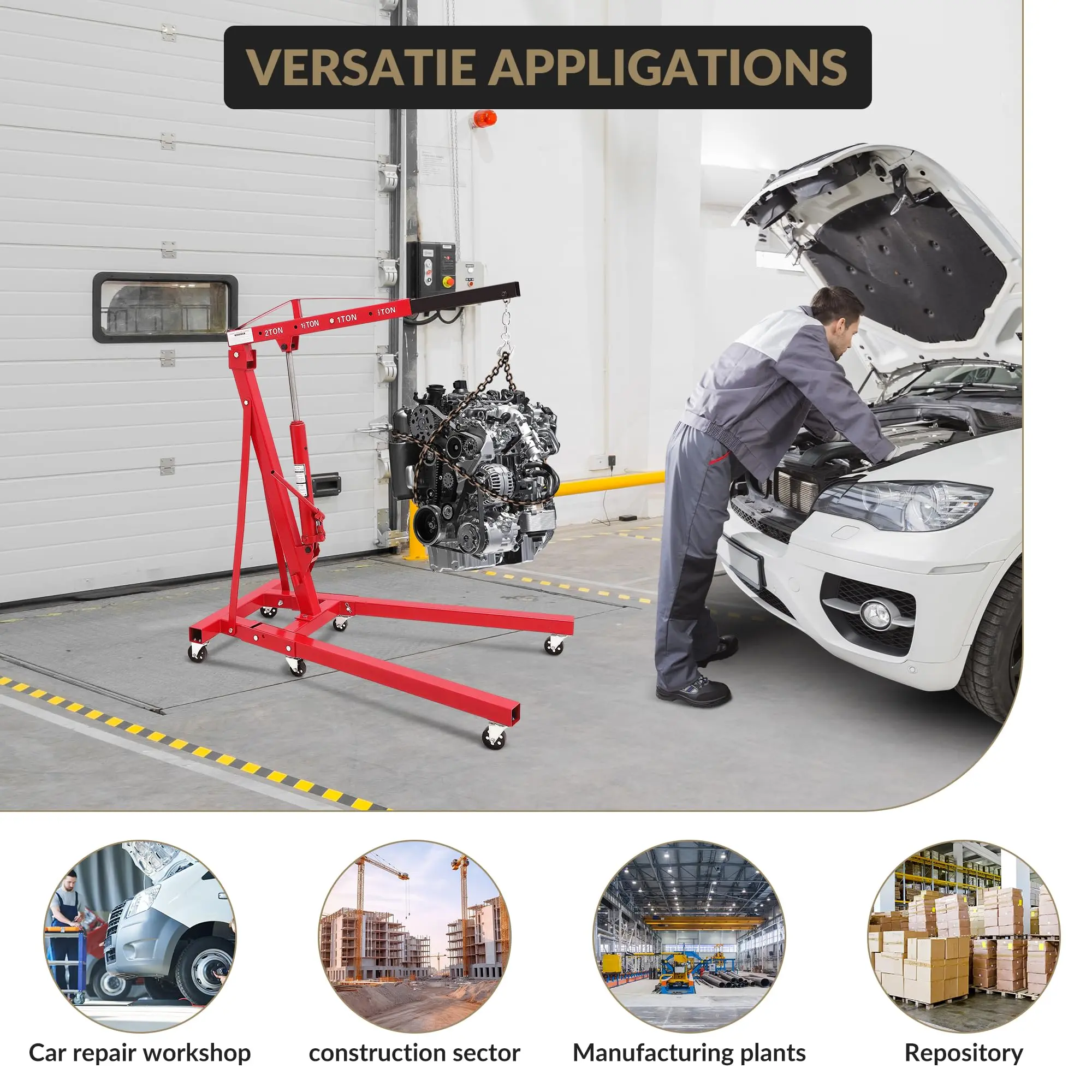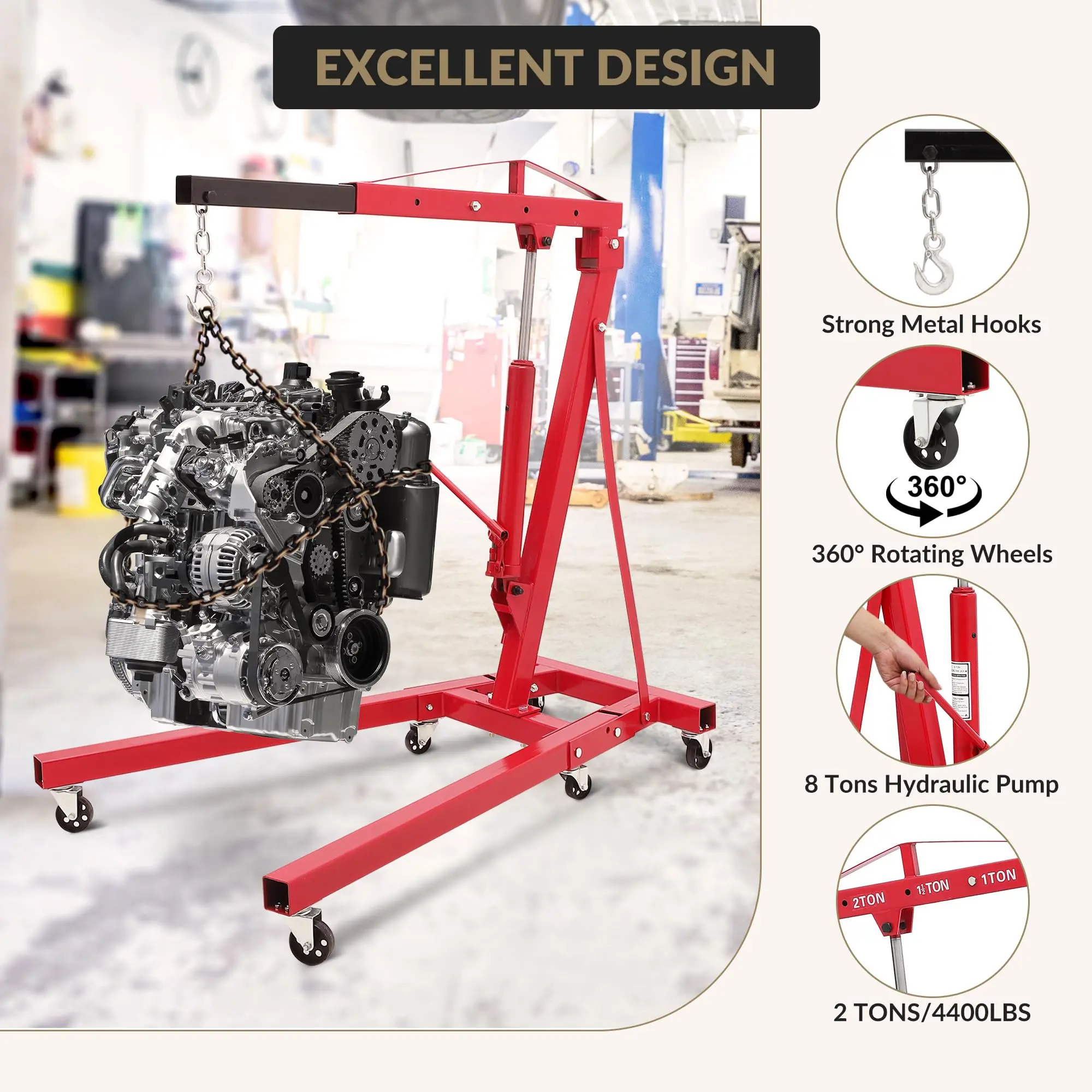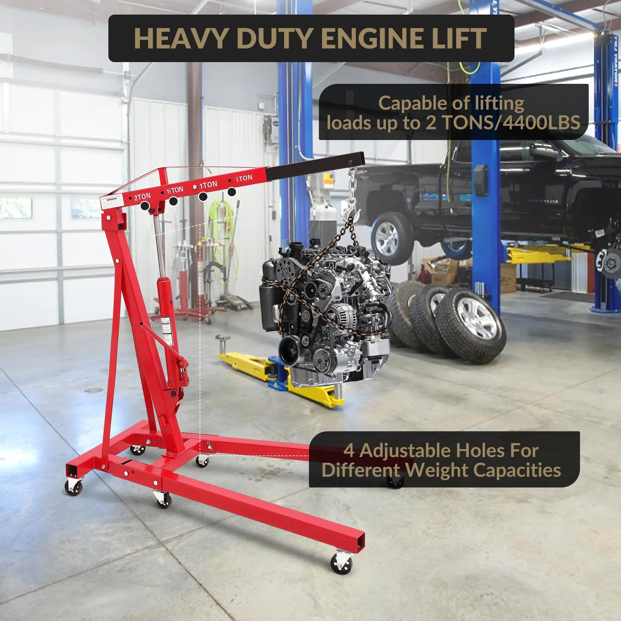 · 2-Ton Load Capacity for Easy Engine Lifting:Our engine hoist handles up to 2 tons (4400 lbs), easily lifting car/truck engines. Ensures safe, labor-saving maintenance in garages/workshops, boosting efficiency.