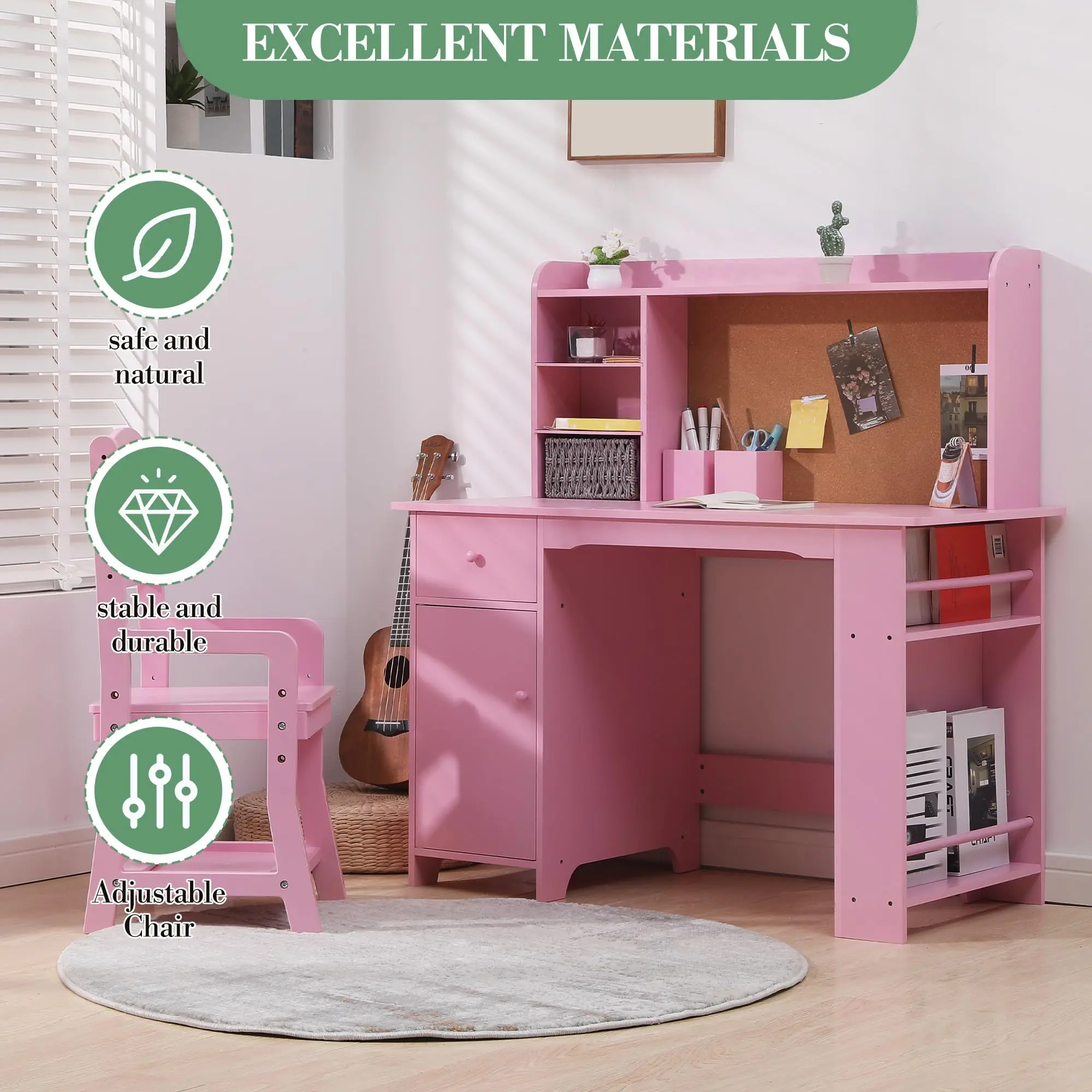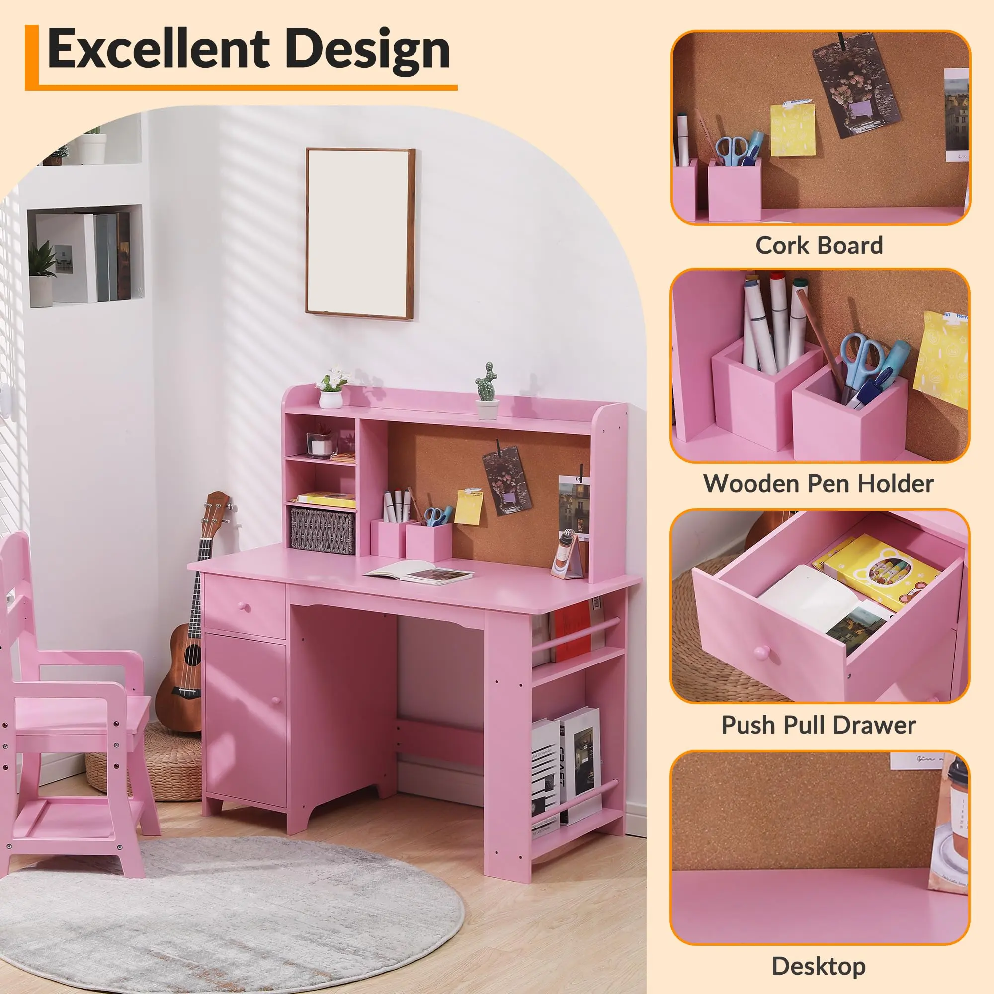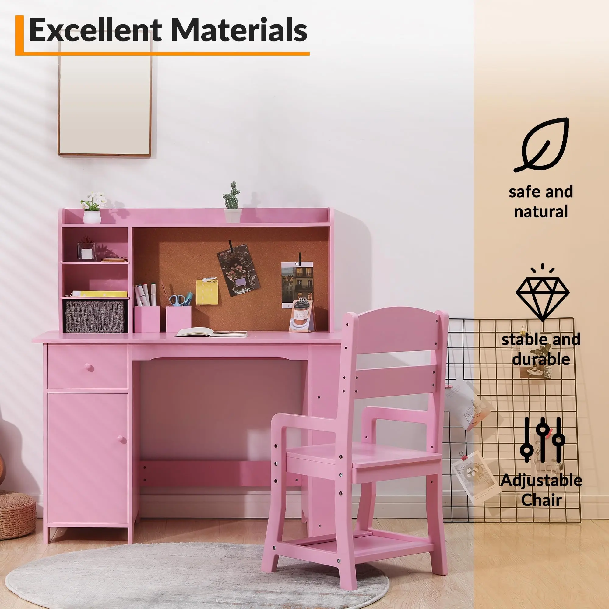 Garvee Children's Study Desk and Chair Set, Wooden Writing Table with Bookshelf, Bulletin Board, Cabinet, and Drawer, Suitable for Ages 3 to 8 Years