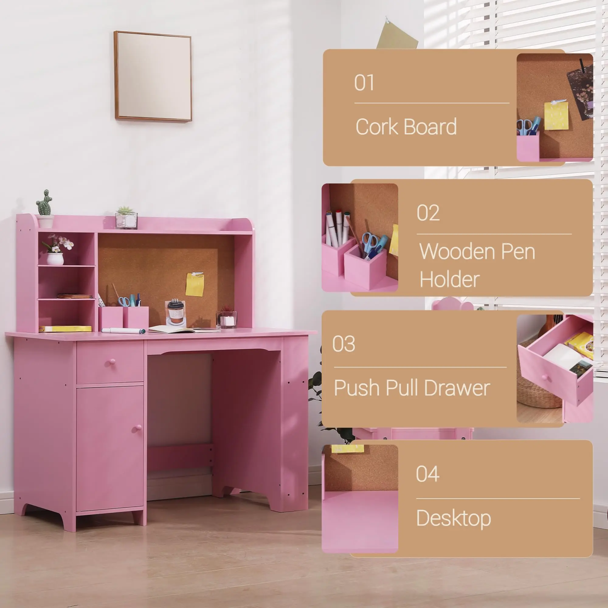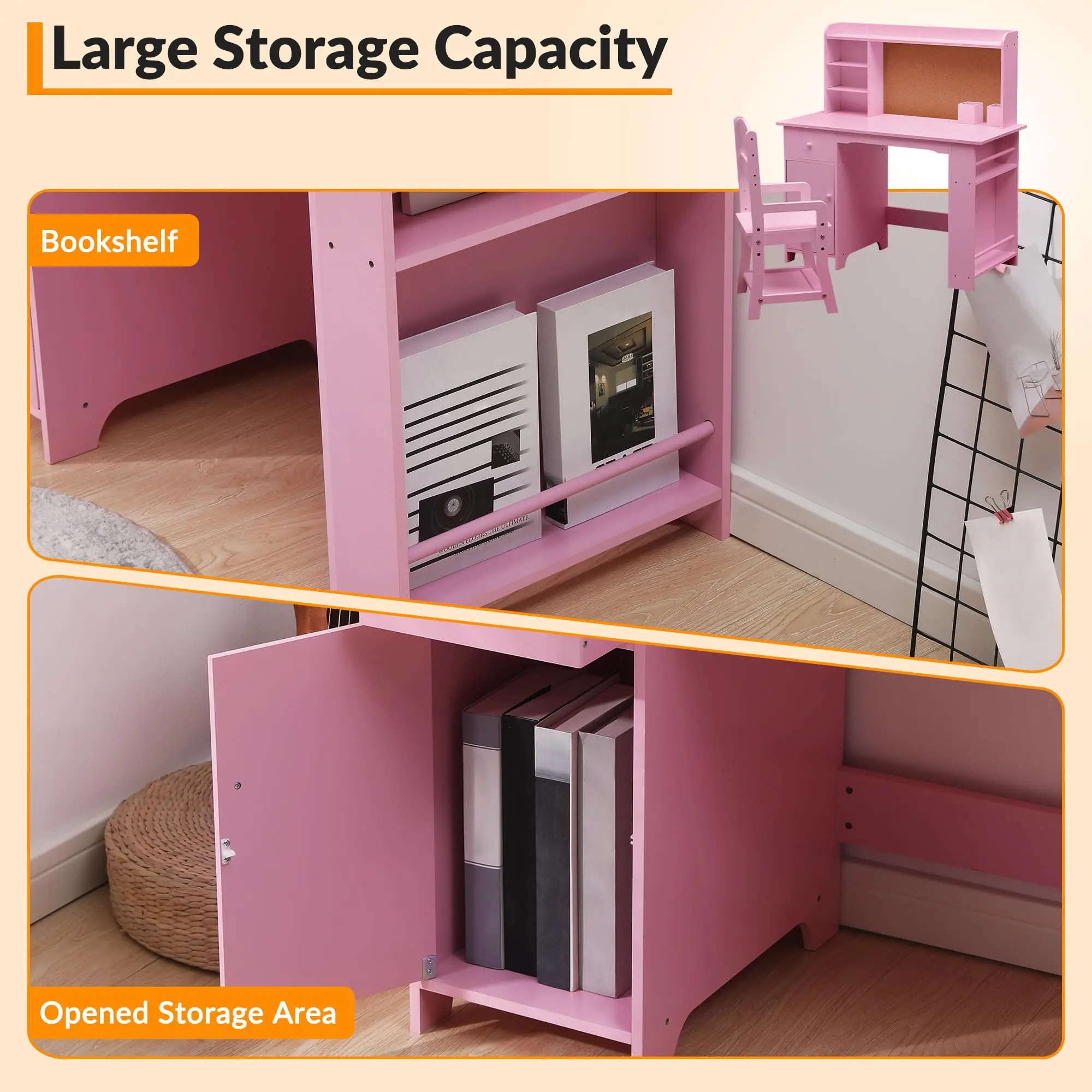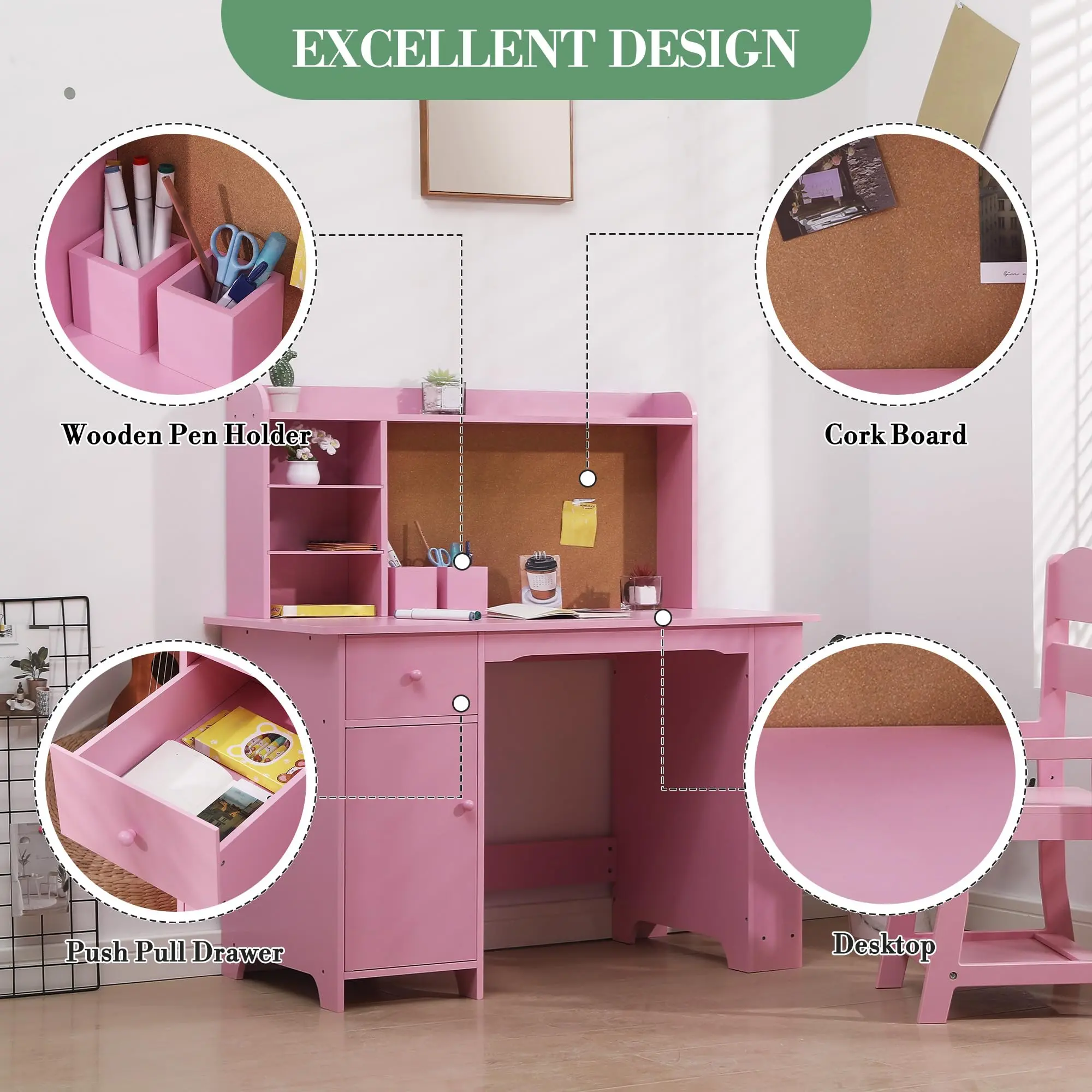 Garvee Children's Study Desk and Chair Set, Wooden Writing Table with Bookshelf, Bulletin Board, Cabinet, and Drawer, Suitable for Ages 3 to 8 Years