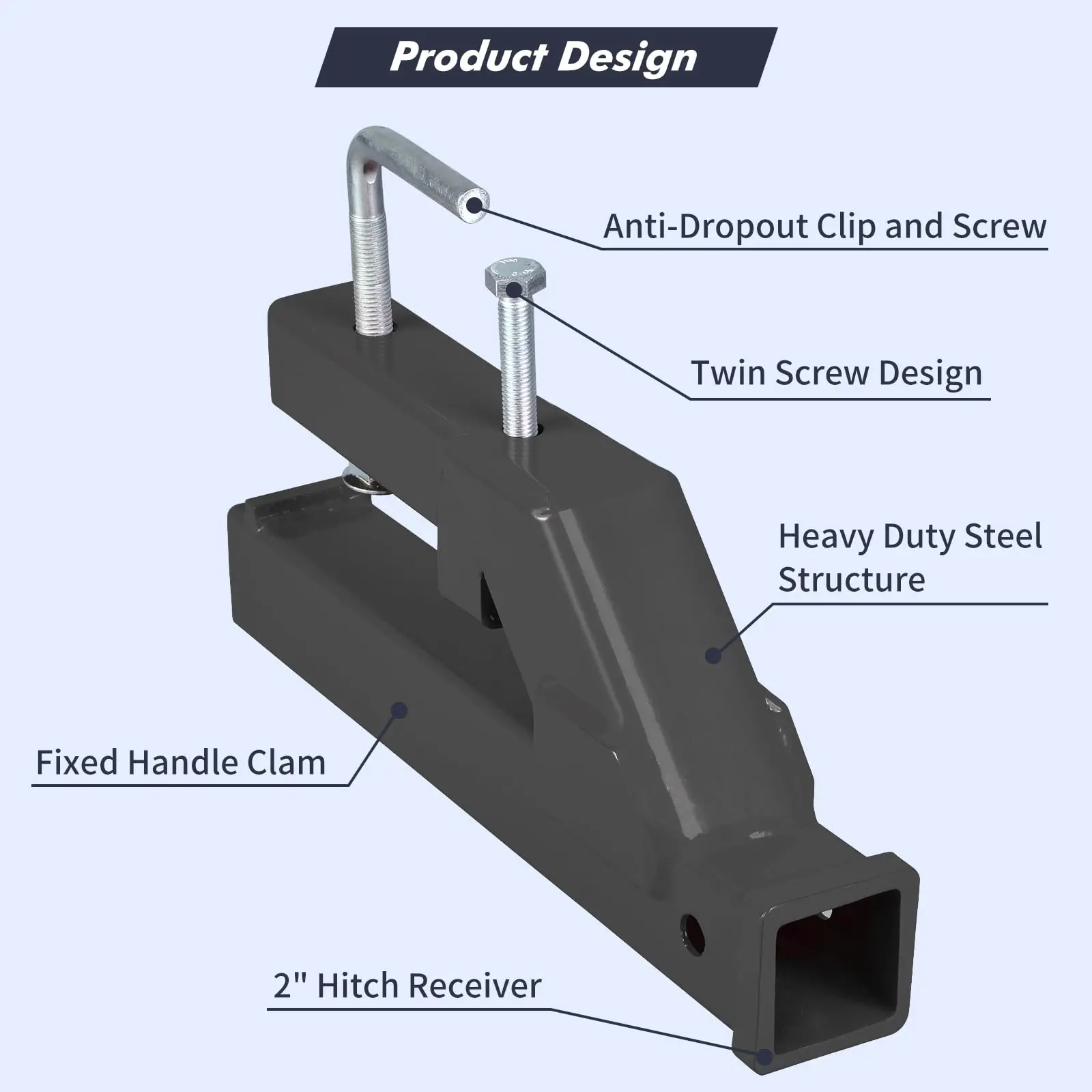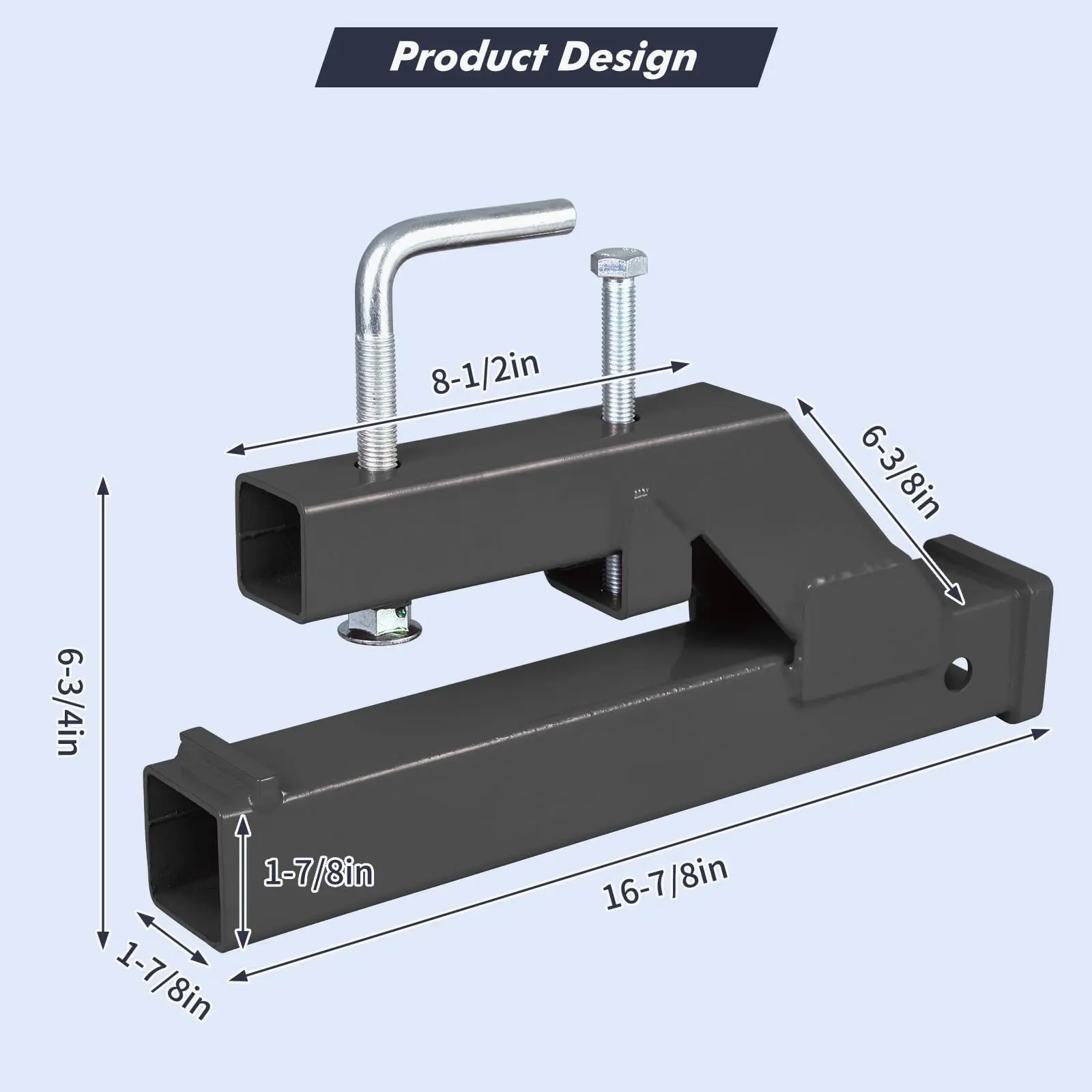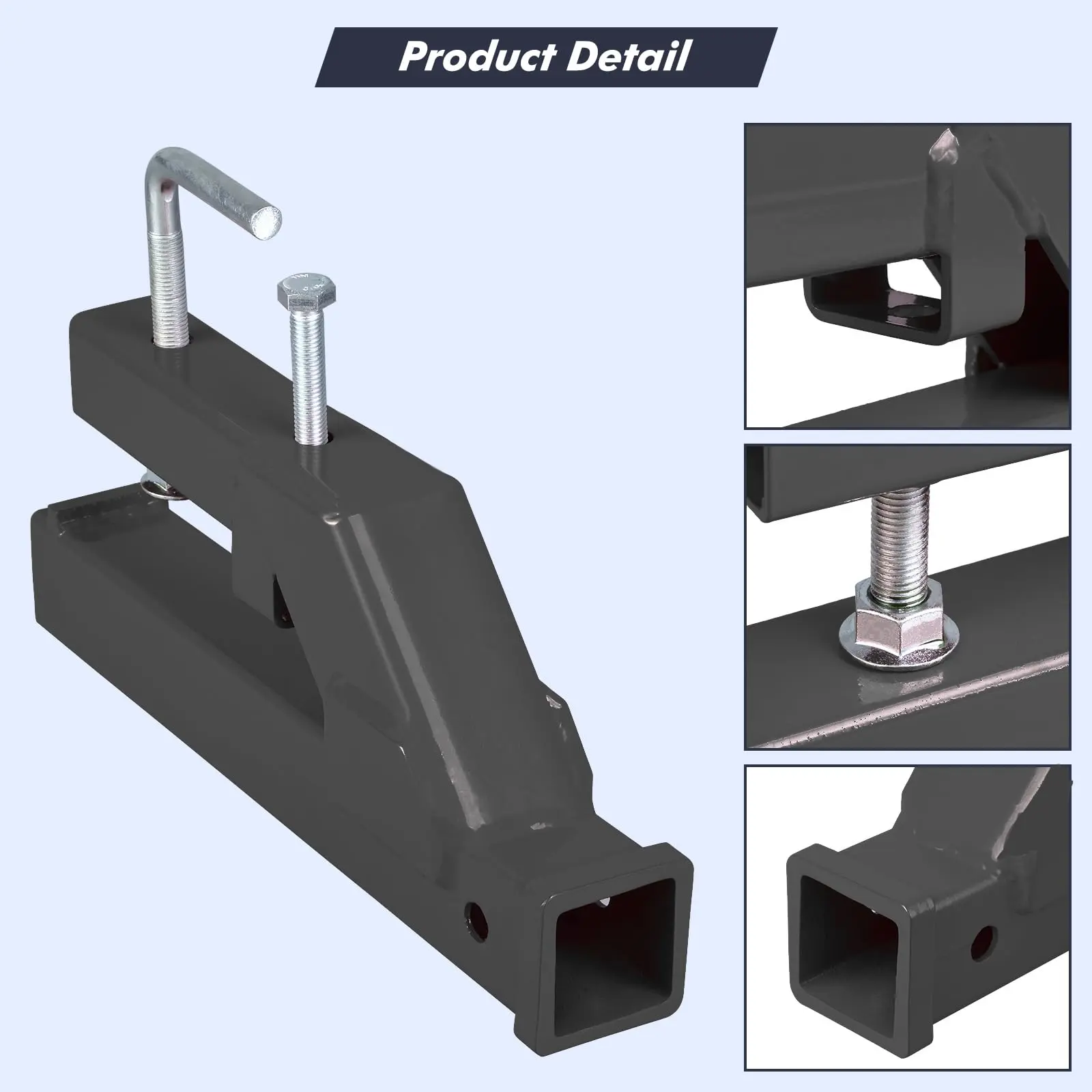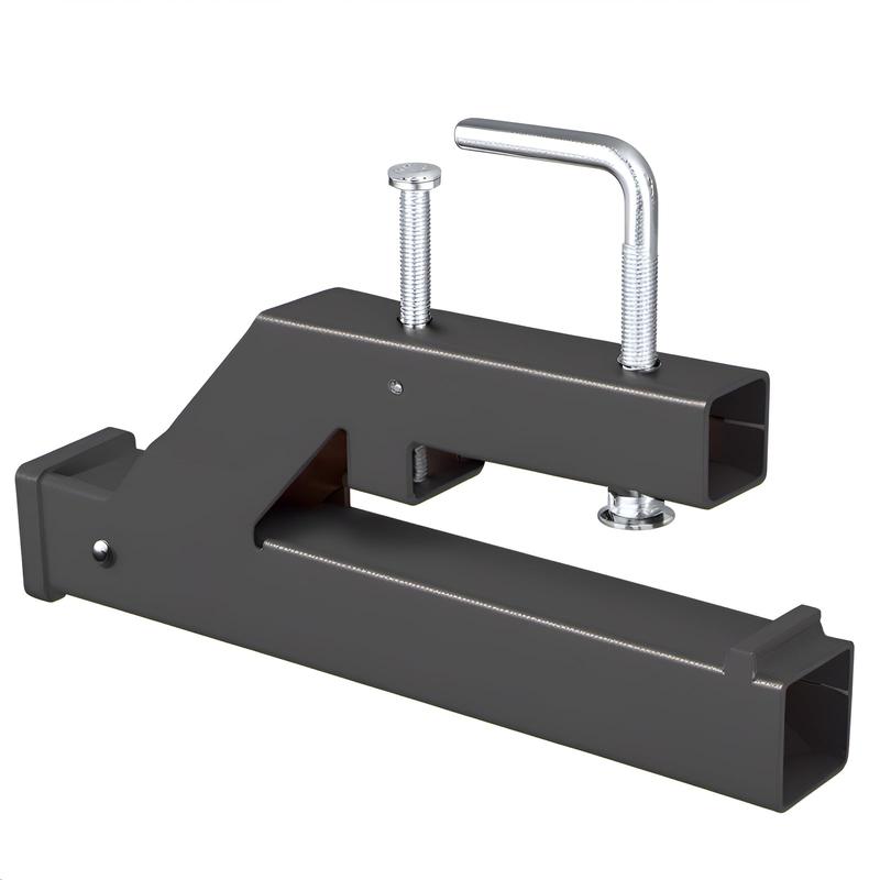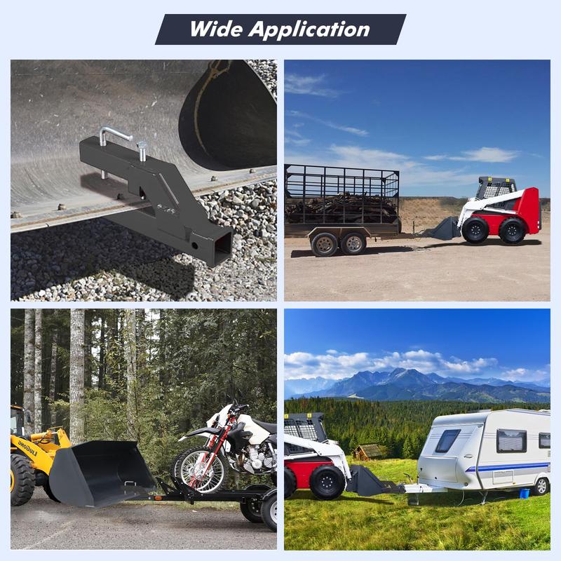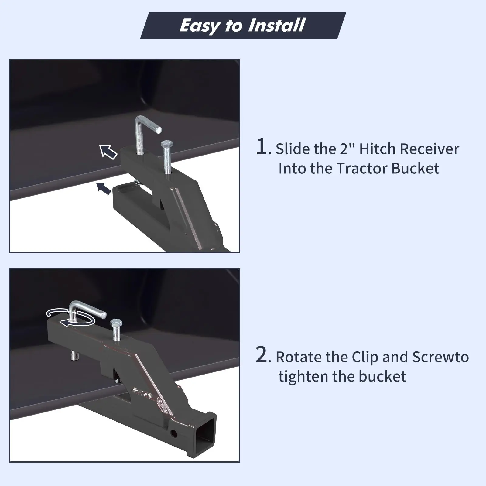 The 2" trailer hitch receiver is designed to easily install on the front of your skid steer or tractor loader bucket. This universal mount slides over the bucket cutting edge and utilizes the underside for leverage. This durable receiver is constructed of an all-steel tubular structure with a secure clamp, puck, and side supports that help to prevent your hitch from turning and twisting when in use. With an impressive weight capacity of up to 1,100 LB, you can tow mid-size trailers and other towable implements.FEATURES: - Redesigned to include side tabs to prevent shifting while in use - Converts a standard tractor bucket into a versatile 2" x 2" receiver - Quickly move your boat, RV, trailer, or camping accessories - Secure bolt clamp and puck fixes hitch onto the bucket lips up to 2" - Not designed for extended towing or hauling - Installs in secondsSPECIFICATIONS: - Height Without Clamp: 7.5-in - Overall Width: 7.5-in - Overall Depth: 16.75-in - Top Tube: 2-in x 2-in - Receiver Inside Tube: 2-in x 2-in - Finish: Powder-Coated Black - Material: Steel - Towing Capacity: 1,100 lb. - Product Weight: 21 lb.