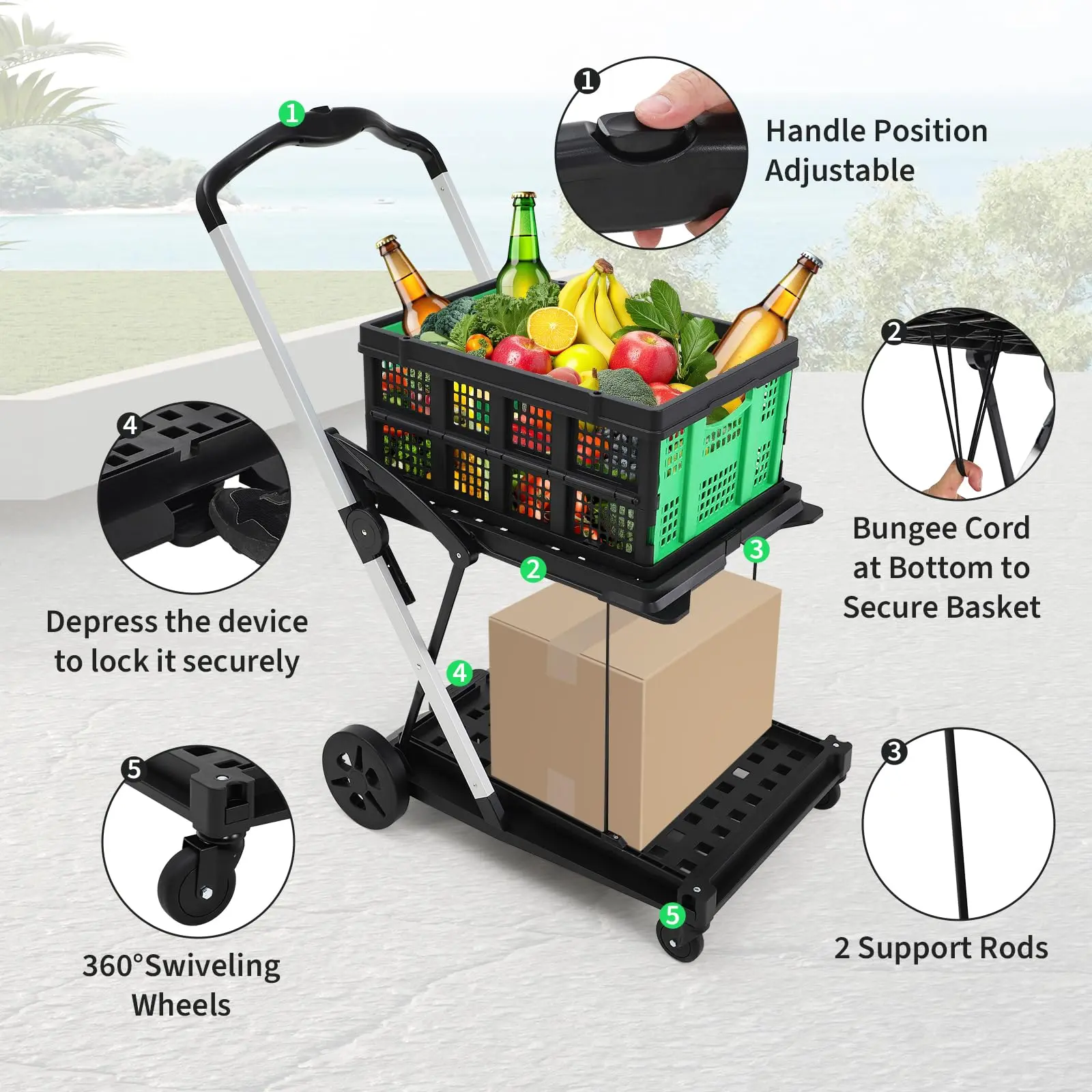 · Durable Yet Lightweight: Crafted from premium aluminum, this portable shopping cart features two support rods beneath the top shelf for enhanced stability. It holds up to 198 lbs total—110 lbs on the bottom shelf and 88 lbs on top. The bungee cord at bottom keeps the storage crate firmly in place, perfect for groceries, office supplies, or heavy loads
