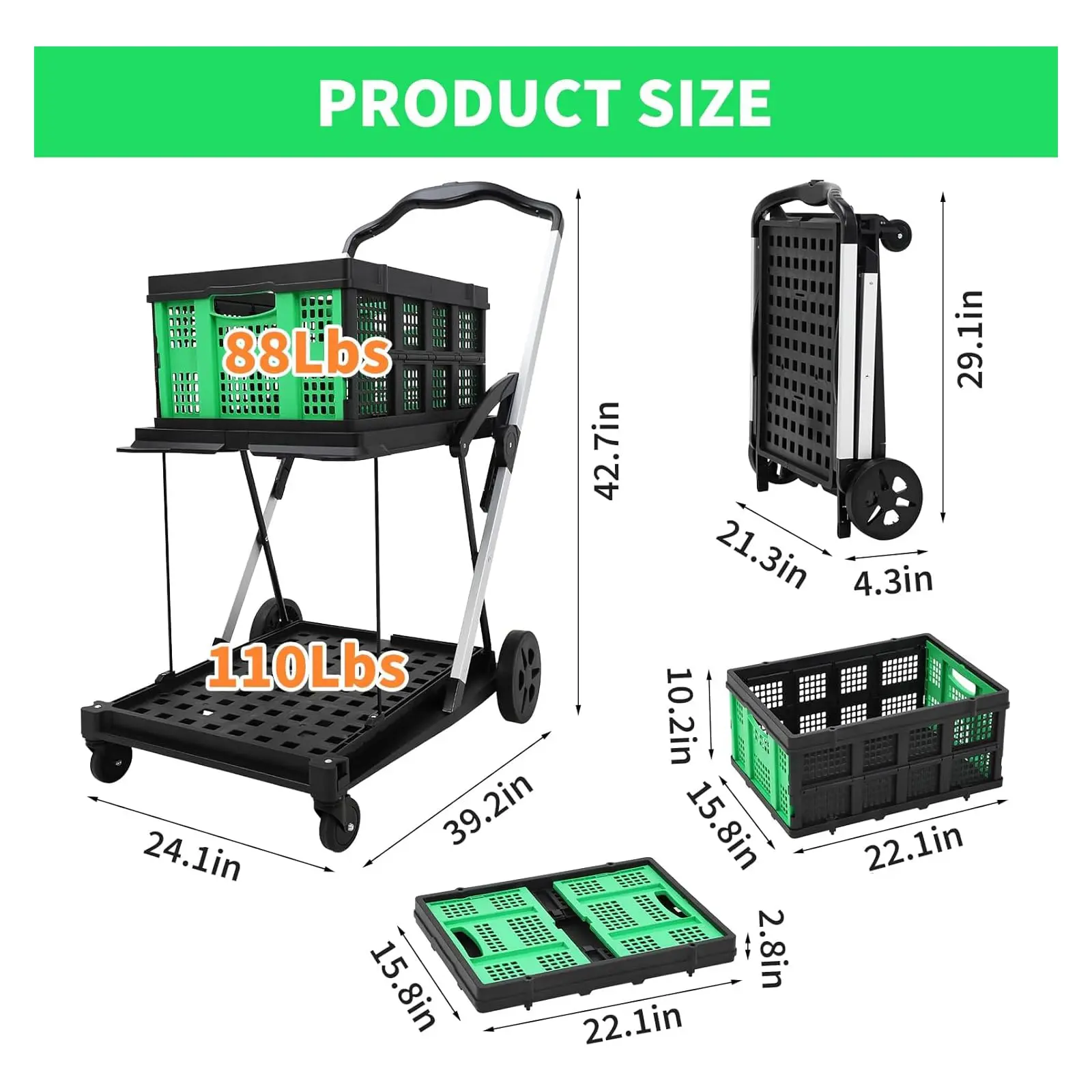 · Collapsible Shopping Cart with Removable Storage Crate: Comes with a premium, collapsible PP storage crate that's sturdy and won't deform. Use the crate independently for small items, making this foldable grocery cart with wheels perfect for hassle-free shopping and easy organization