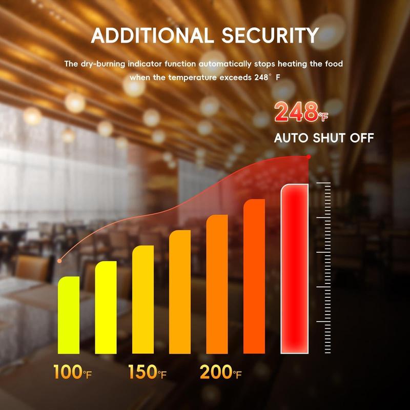 · Adjustable Temperature Control:A precise temperature controller allows for temperature adjustment from 86°F to 176°F, keeping food at its optimal eating temperature and preventing overcooking or drying.