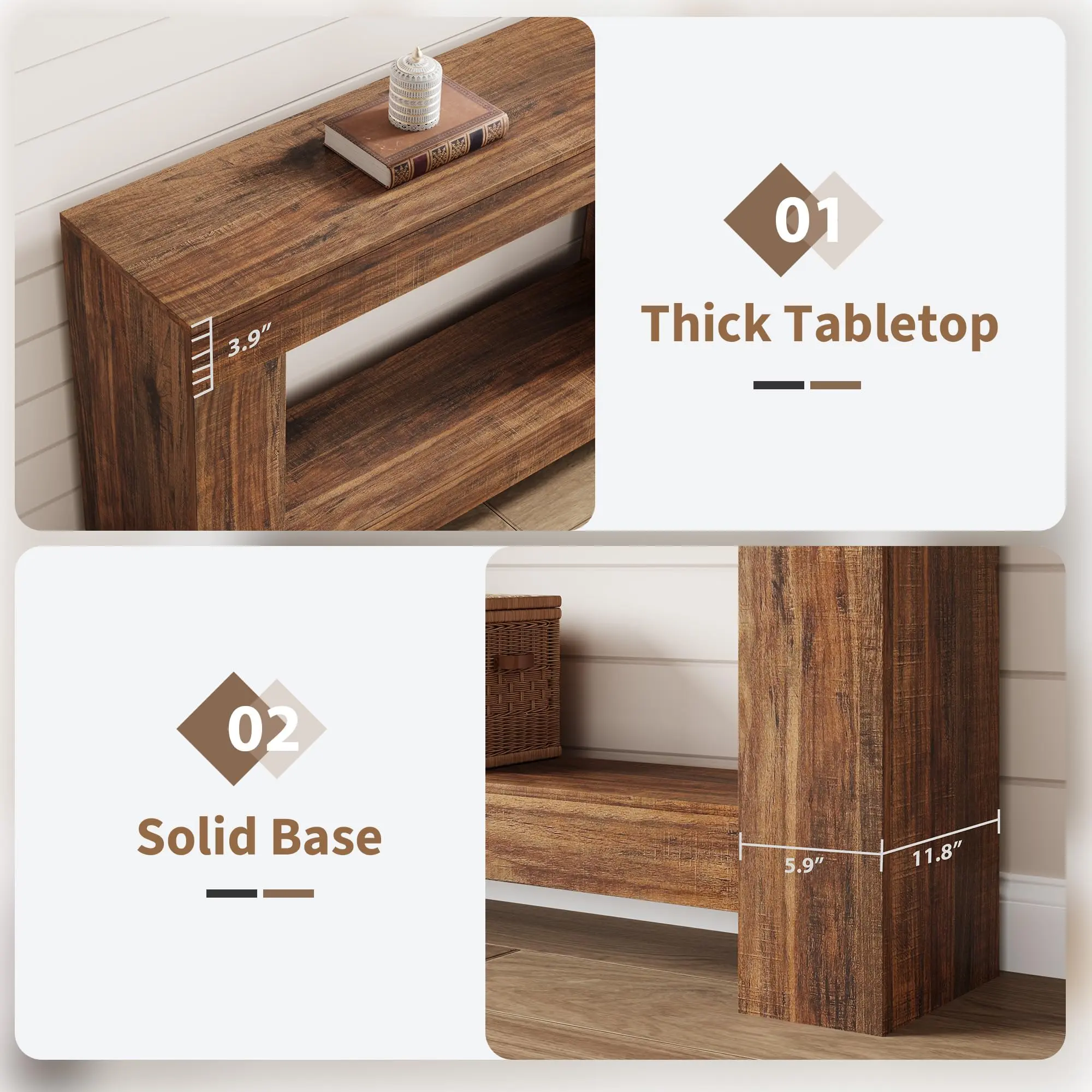 · Heavy-Duty Base: This wood console table for living room features a sturdy and reliable base (11.8" x 5.9"), which can keep the stability and strength of the entrance table, enabling it to bear heavy loads