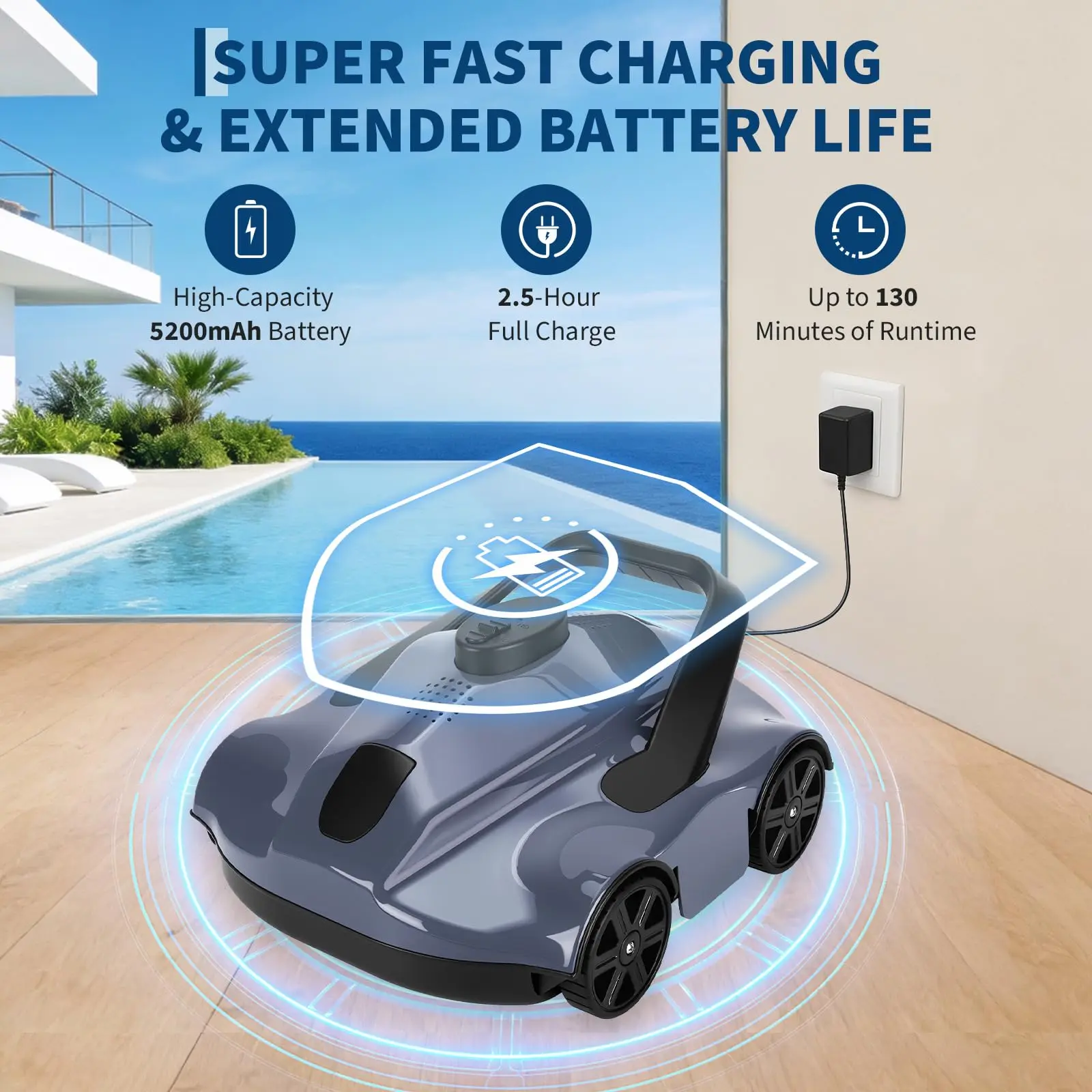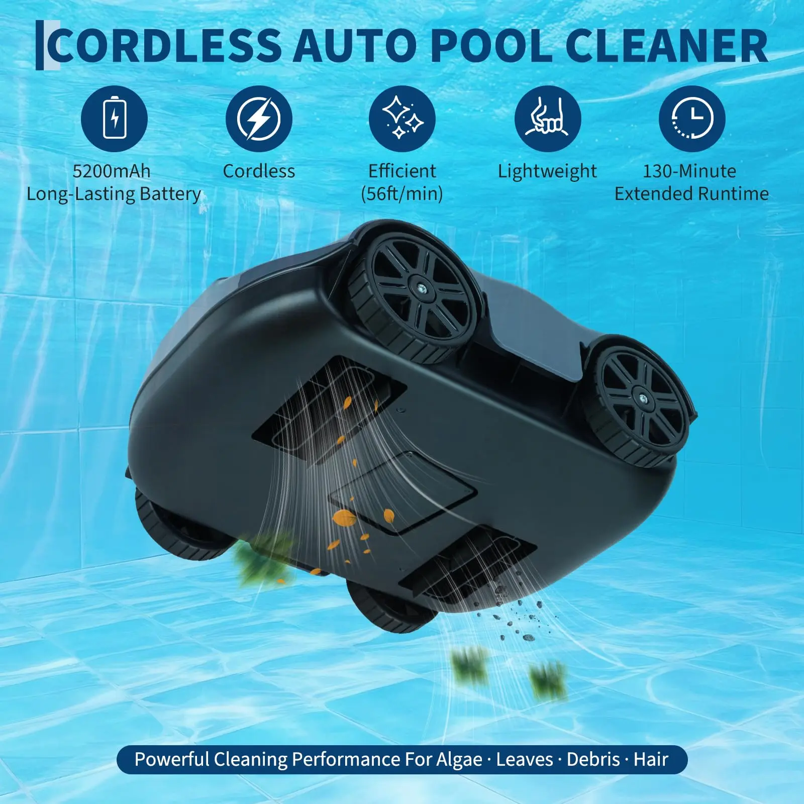 · Long-Lasting Battery for Large Pool Coverage - With up to 130 minutes of continuous cleaning, this pool vacuum can handle pools up to 860 square feet. It’s the perfect cordless robotic pool cleaner for maintaining medium and large above-ground pools efficiently.