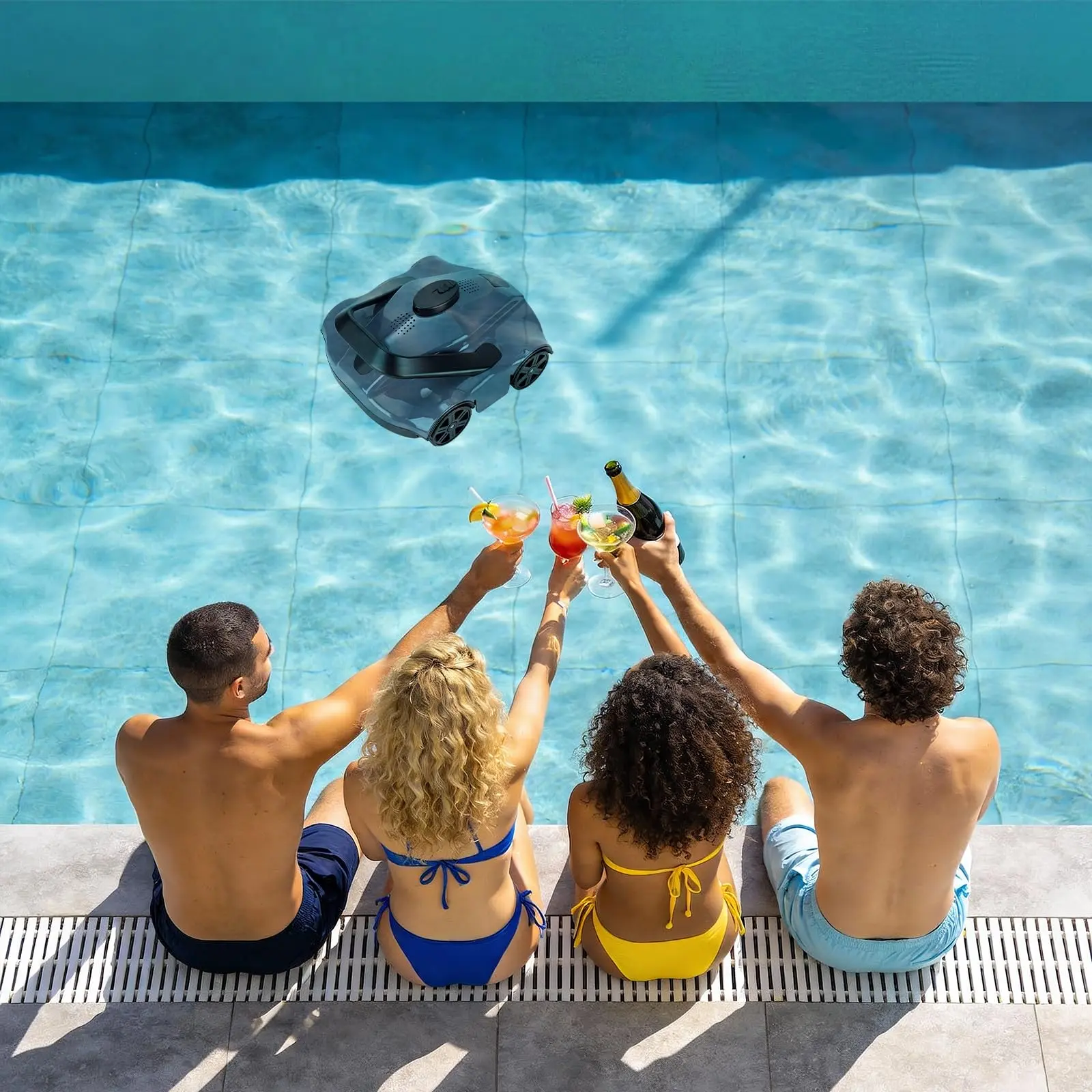 · Powerful Suction for a Spotless Pool - This cordless robotic pool vacuum delivers deep cleaning performance, picking up leaves, dirt, and debris with ease. Its advanced filtration ensures your above-ground pool stays crystal clear and ready for fun all season long.