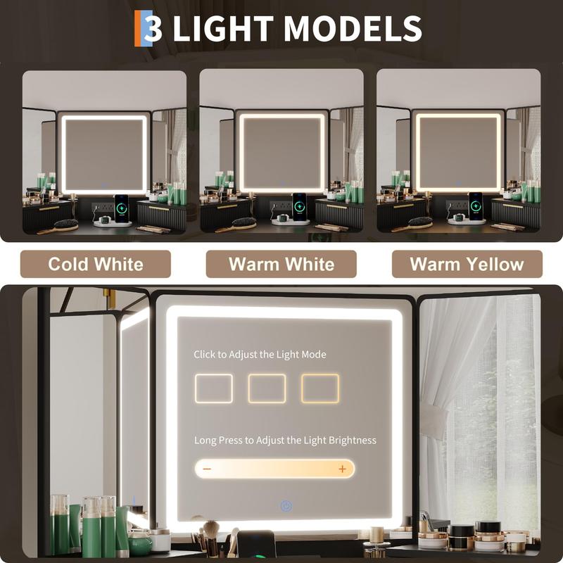 · Three-Way Mirror & Custom Lighting: Get flawless results from any angle! The three-way mirror system provides a comprehensive view, while touch-controlled lights with three color modes and adjustable brightness ensure perfect lighting for makeup, hair styling, or skincare routines