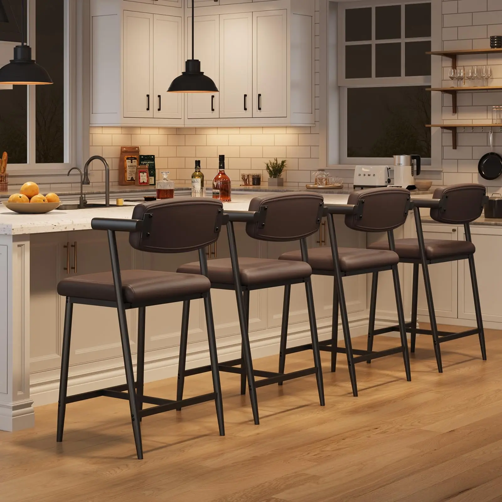 · 5. Adaptable Design, Timeless Appeal: This set of 4 counter-height bar stools seamlessly integrates supportive backs and arms with two enduring finish options: stylish gray and rustic brown. Their versatile transitional design instantly elevates kitchen islands, bars, dining tables, counters, or farmhouse settings – equally suited for commercial or residential use. These bar stools set of 4 deliver ergonomic support while enhancing your space’s inviting aesthetic appeal