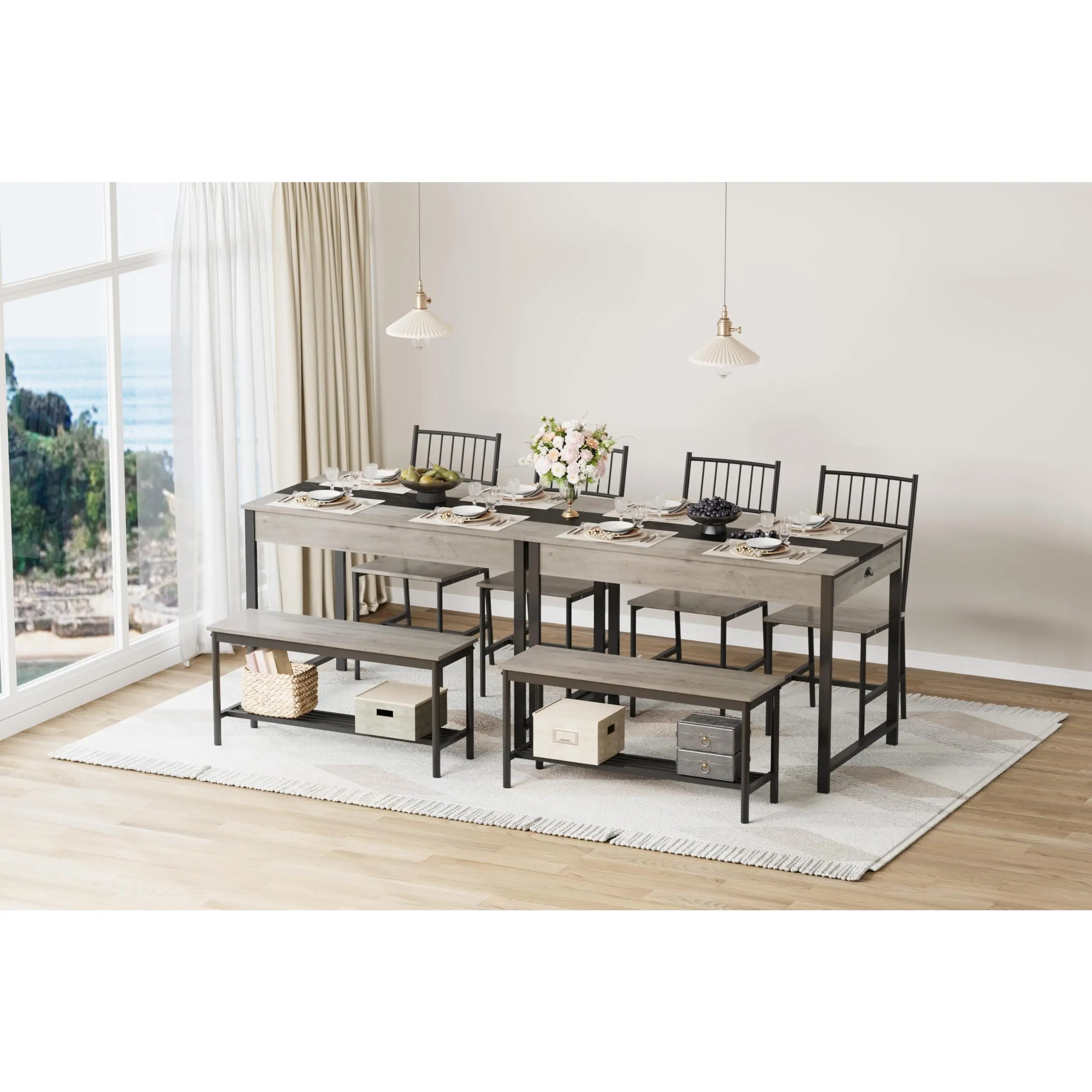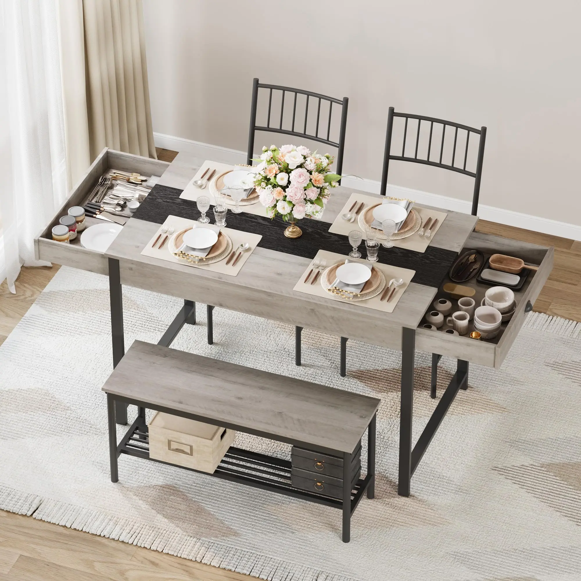 · 【Extra Storage Solutions】Elevate your home with Garvee's small kitchen table set for 4, featuring storage racks for the bench which allows for flexible seating arrangements, providing ample room for larger items and enhanced stability with a cross bar between the legs. Featuring drawers on both sides of the dinning table set, this table set provides ample storage for utensils and seasonings, keeping your dining area organized and tidy.