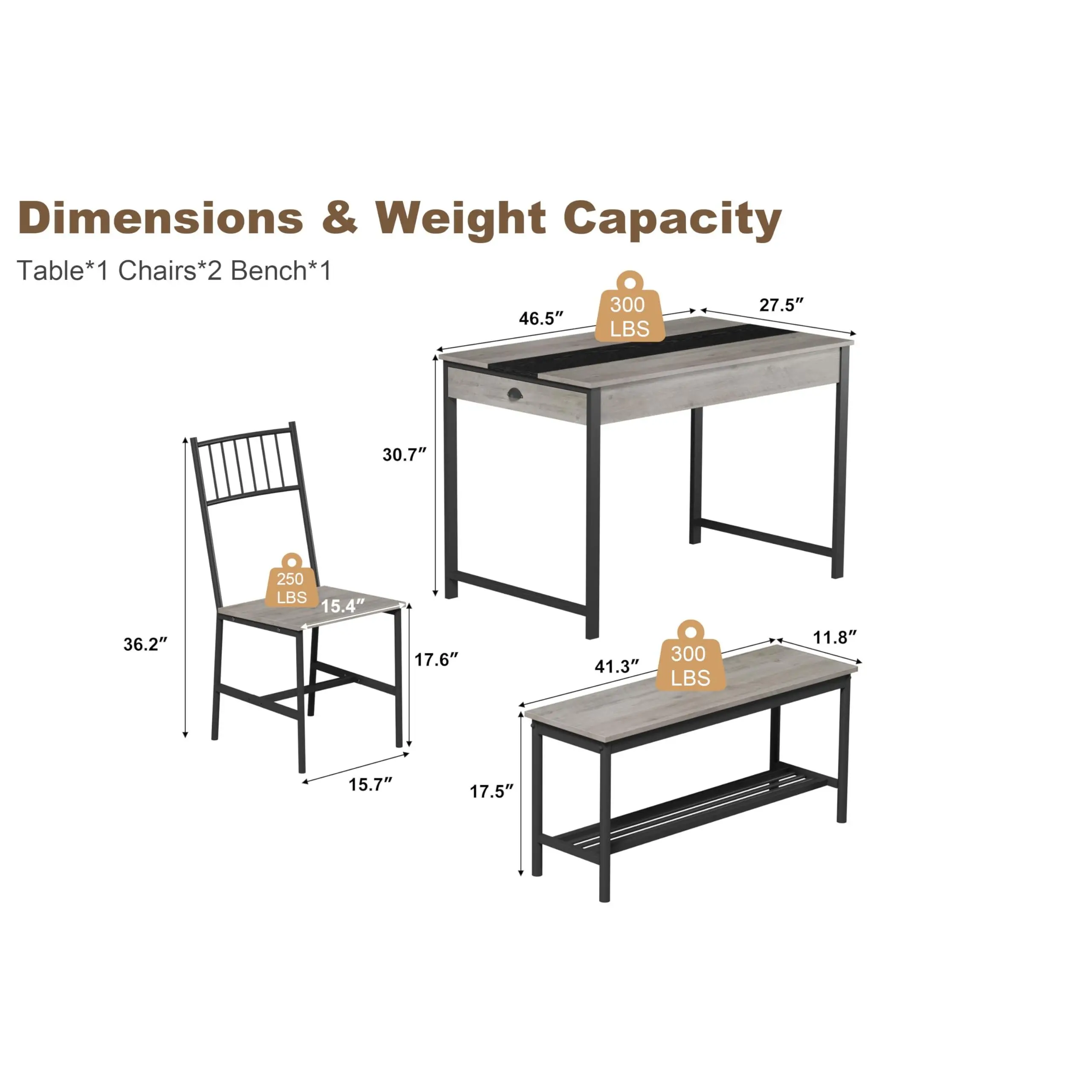 · 【Space Saving Dining Table】This Garvee Dining Table Set for 4 includes a spacious table, 2 cozy chairs, and a 2-seat bench. The chairs and bench can be conveniently stored underneath the table when not in use, maximizing space, making it perfect for small spaces and keeping your home tidy and organized. Perfect kitchen table size for 4 : Table dimensions: 46.5 in L x 27.5 in W x 30.7 in H; chair capacity: 250 LBS; bench capacity: 300 LBS, making it ideal for families or as a versatile working table
