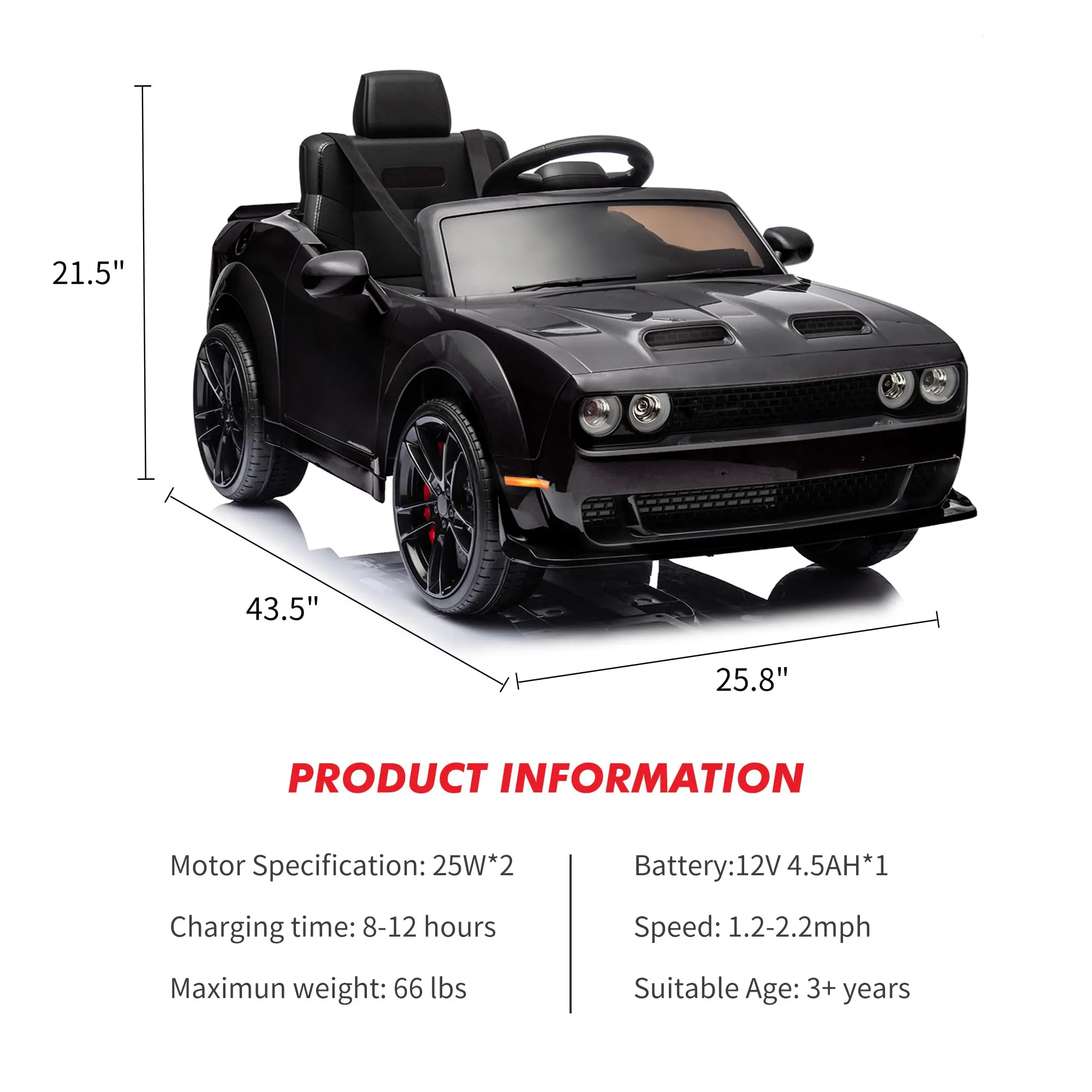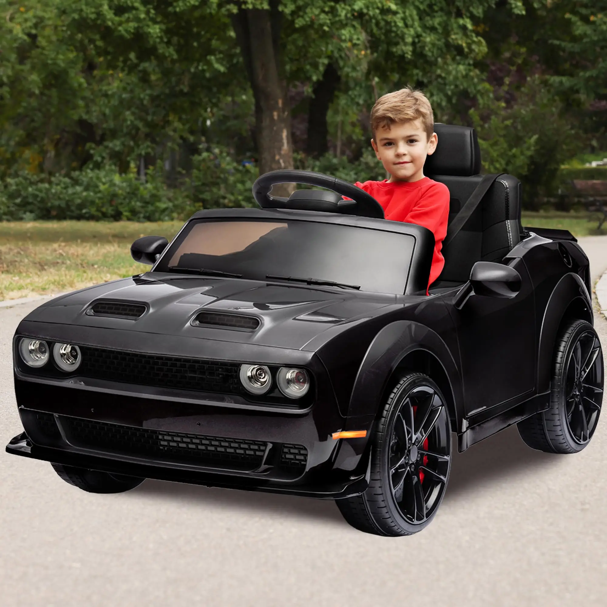 · AUTHENTIC DRIVING EXPERIENCE: Officially licensed Dodge Challenger ride-on car features LED headlights, authentic engine sounds, and a functional steering wheel to give your child a lifelike driving adventure. Dimensions: 43.5"L × 25.8"W × 21.5"H.