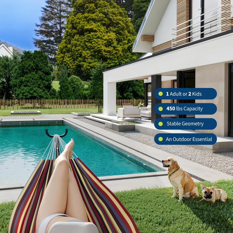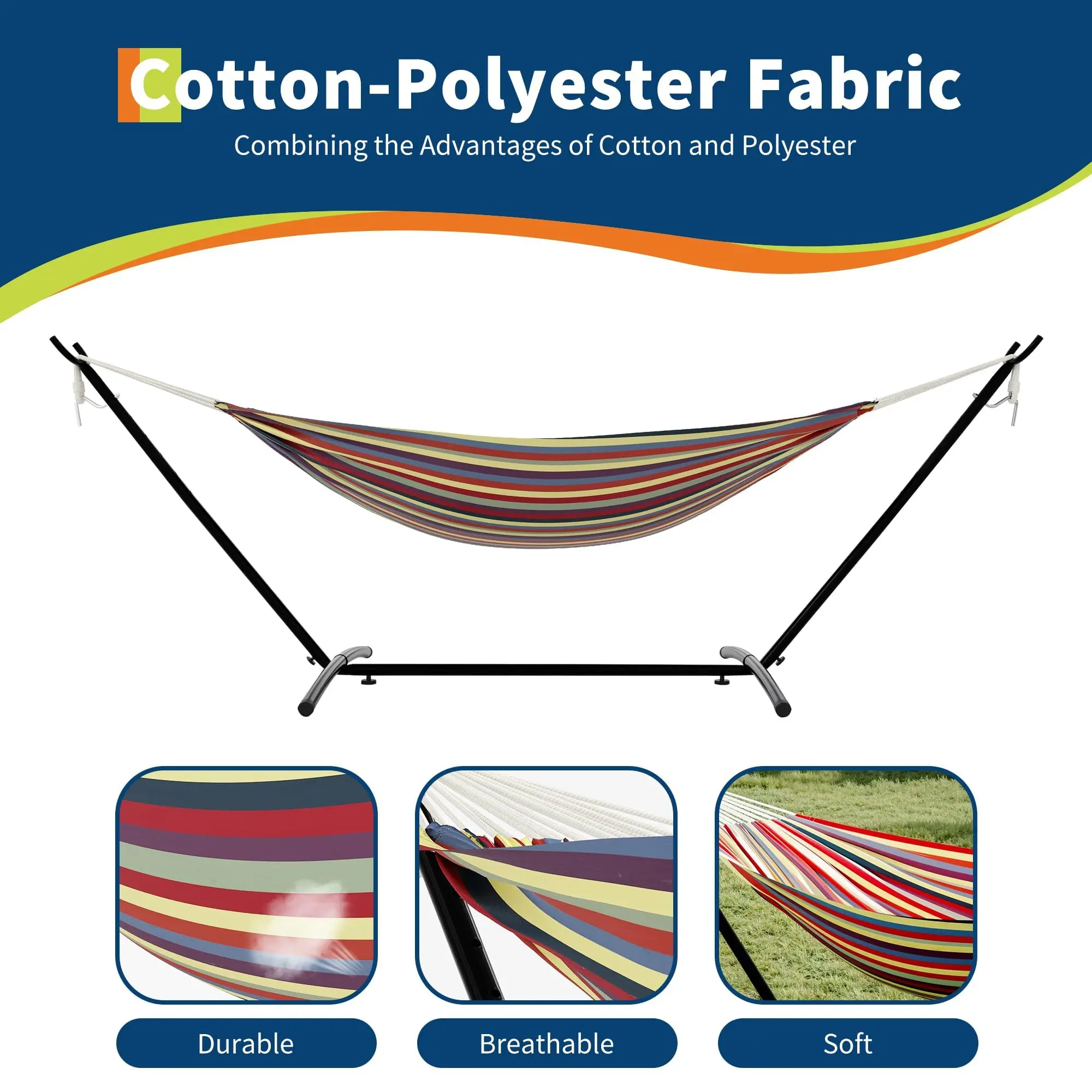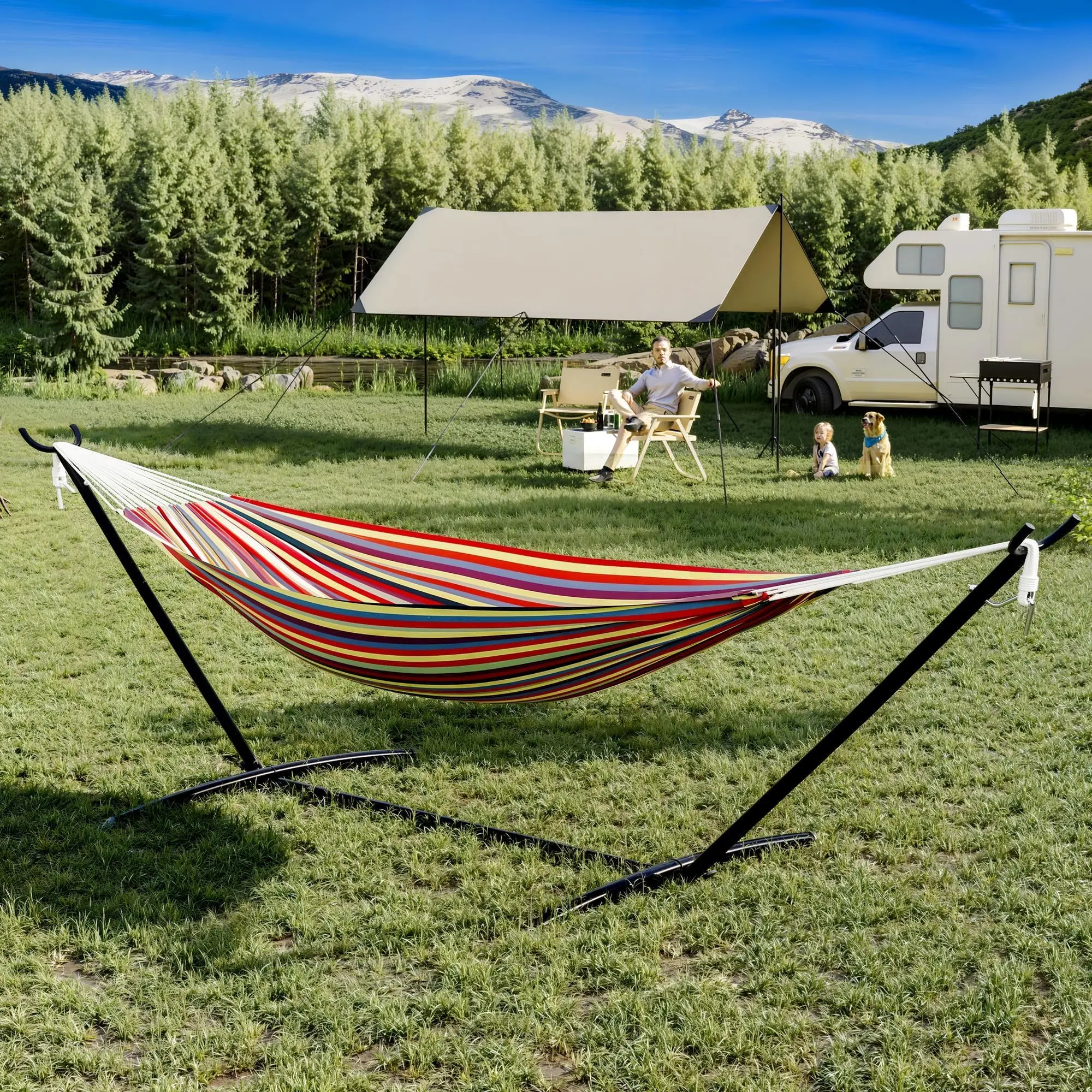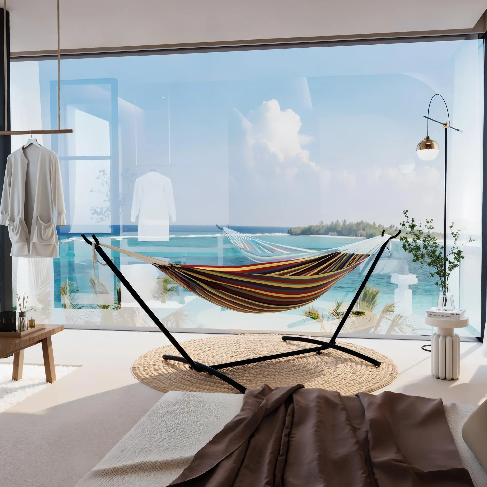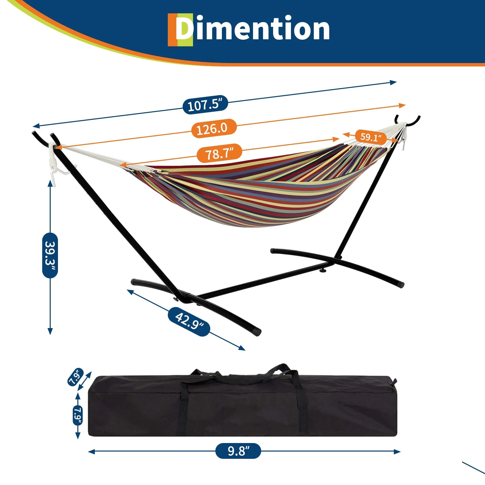· Stylish Brazilian Style: Eye-catching contrasting color stripes combined with a sleek black steel stand make this hammock a vibrant highlight for any yard or outdoor space.