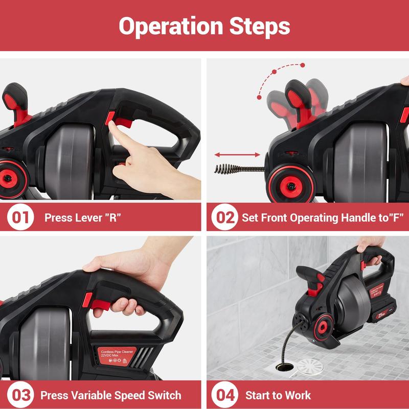 · Cordless Drain Cleaner: The electric drain snake is battery-powered, making it ideal for both professionals and DIYers. Whether you’re clearing pipes indoors or outdoors, there’s no hassle with power cords. Additionally, the drain auger comes with built-in LED work lights, so you can effortlessly complete your tasks even in dark or dimly lit areas.