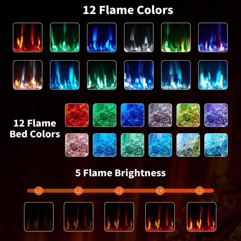 · Customizable Flame Ambiance: Create your ideal atmosphere with 12 flame colors, 12 ember bed colors, and 5 brightness levels. This electric fireplace includes interchangeable log and crystal media, making it easy to match modern or traditional décor year-round.