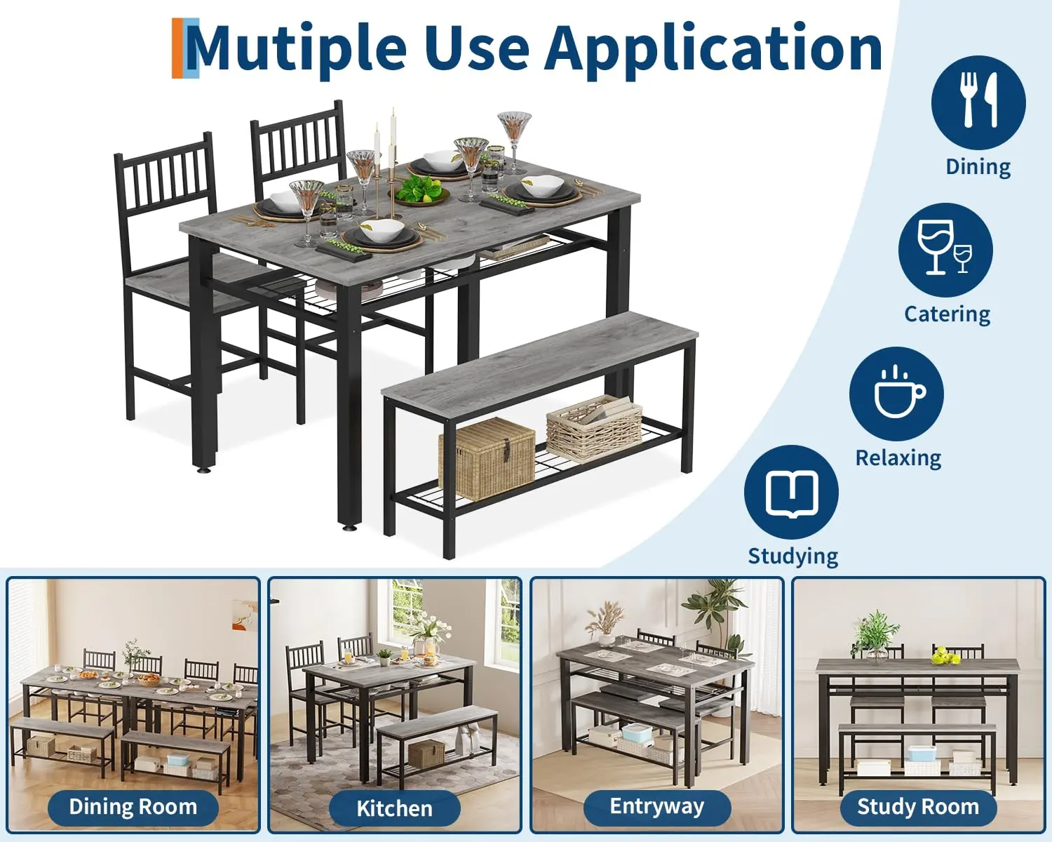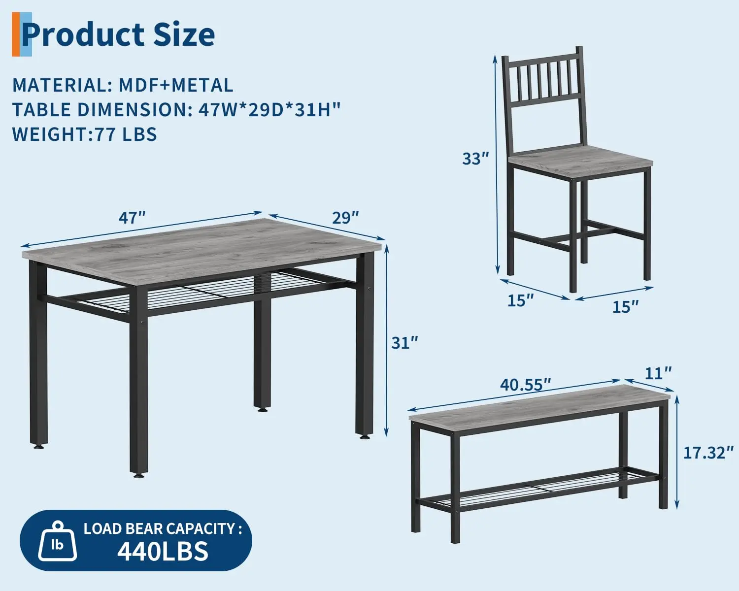 · Space-Saving Storage Bench: Our spacious rectangular kitchen table set with chairs and Bench comes with 2 wood chairs and one long bench which can create the perfect dining experience for either friends or family.Bench and chairs nest easily under the table to maximize space in small apartments or compact kitchens. The bench’s built-in shelf provides extra storage for your essentials.