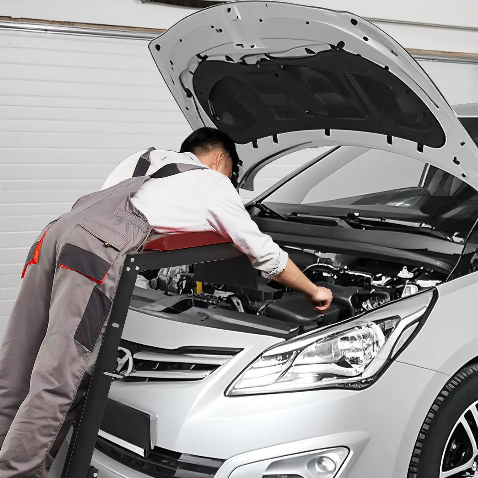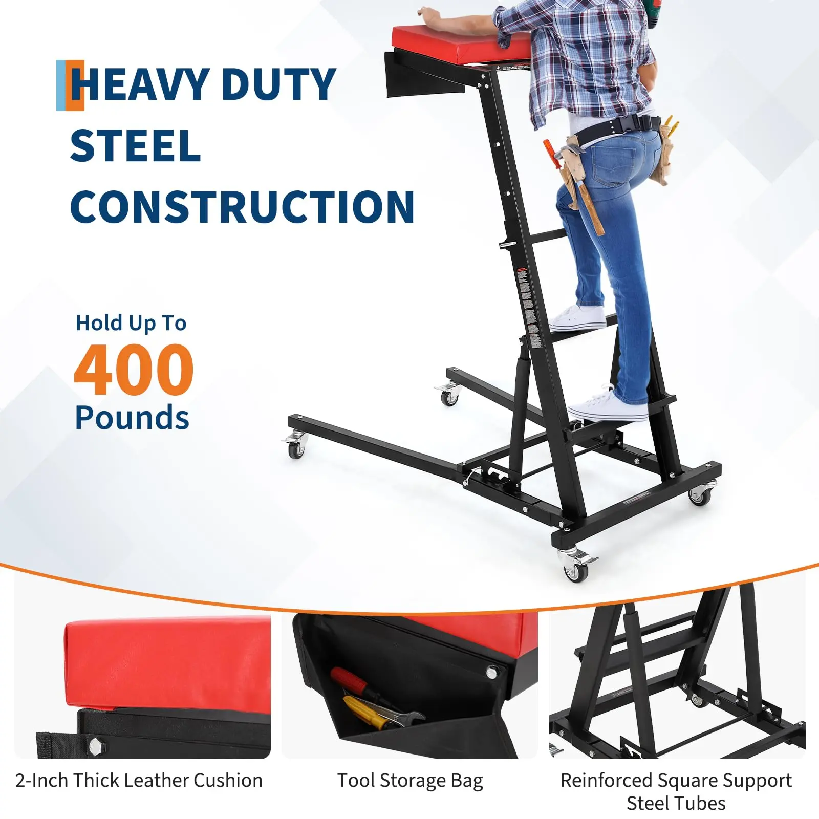 · Integrated Workshop Efficiency Features: This automotive creeper includes a convenient tool pouch for easy access to essentials, minimizing downtime. The wide stepping platform ensures secure footing and reduces fatigue, making it ideal for elevated tasks and extended standing periods. Top side creeper can be folded when not in use for compact storage.