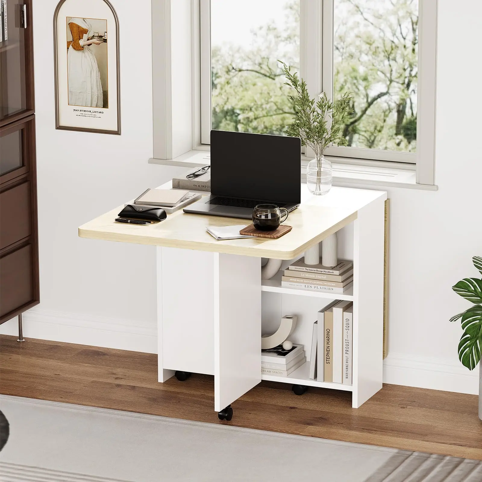 【GARVEE】Foldable Drop Leaf Dining Table with 2-Tier Storage and 6 Wheels, Space-Saving Folding Kitchen and Dining Room Table Ideal for Small Spaces