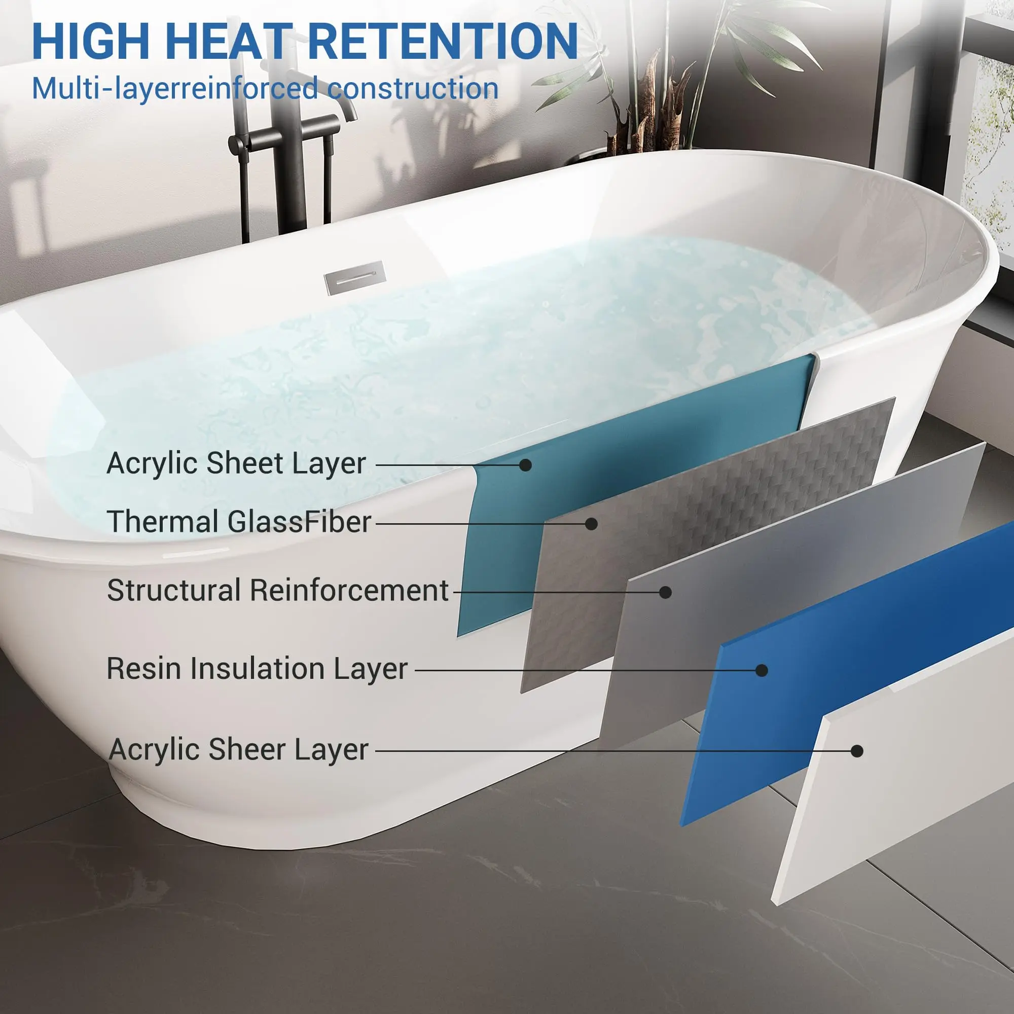 · 【Premium Acrylic Craftsmanship – Durable, Lightweight, and Timeless】Crafted from high-gloss acrylic reinforced with fiberglass resin, this freestanding bathtub delivers excellent durability while remaining lightweight for easier installation. The smooth, non-porous surface resists scratches, fading, and discoloration, keeping your bathtubs looking bright and pristine for years. Enhanced insulation helps every soaking tub maintain warmth for a consistently comfortable bathing experience.