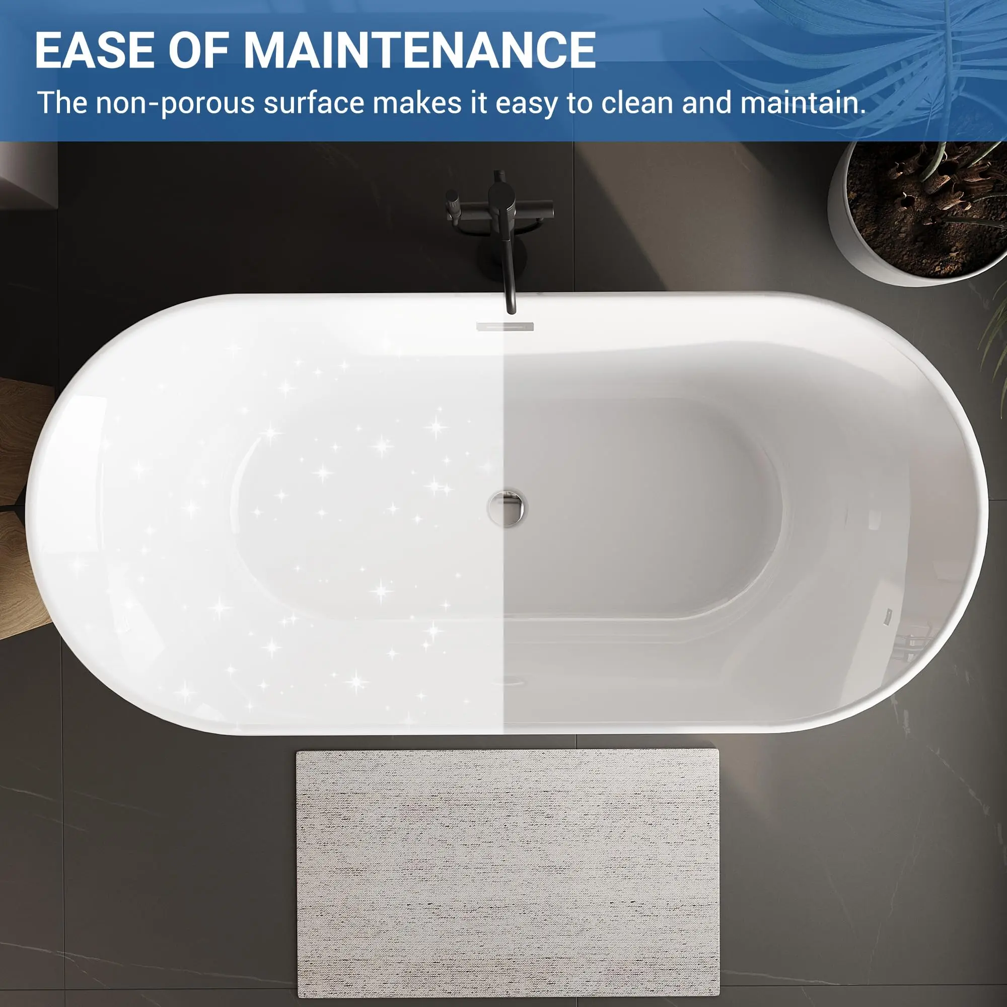 · 【Quick Installation & Easy Maintenance – More Time to Relax】Designed with a pre-installed drain and overflow, this free standing tub allows for faster installation—often completed in under 40 minutes. The easy-clean acrylic surface wipes down effortlessly, reducing maintenance time and letting you spend more moments enjoying a relaxing soak in your freestanding bathtub rather than cleaning it.