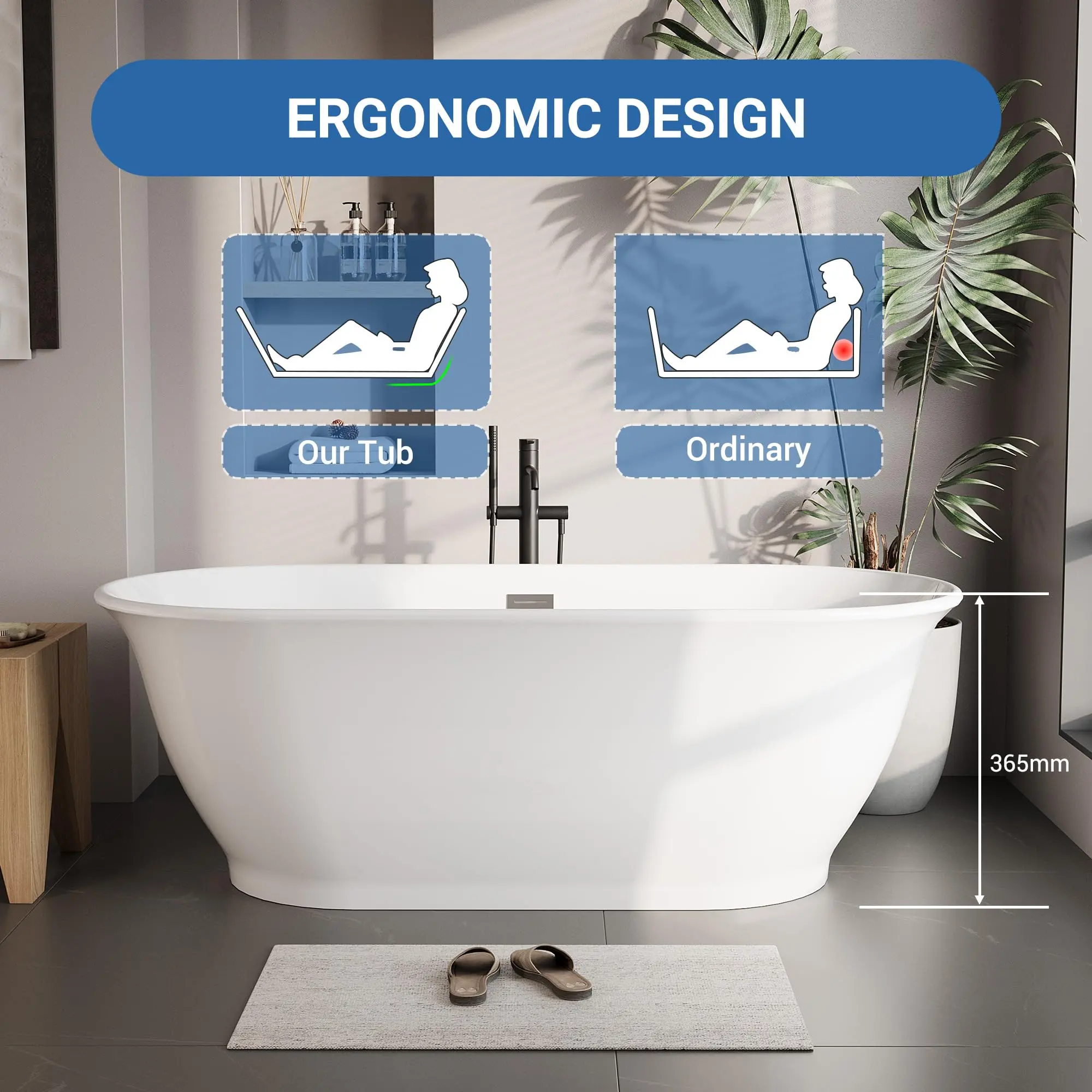 · 【Ergonomic & Modern Design – Comfort That Embraces You】This free standing tub features a gently reclined backrest that supports your spine, while the spacious interior allows comfortable movement during extended soaks. Clean lines and a minimalist silhouette elevate this freestanding tub into a serene, spa-inspired centerpiece—perfect for those who value both comfort and modern elegance in their bath tub design.