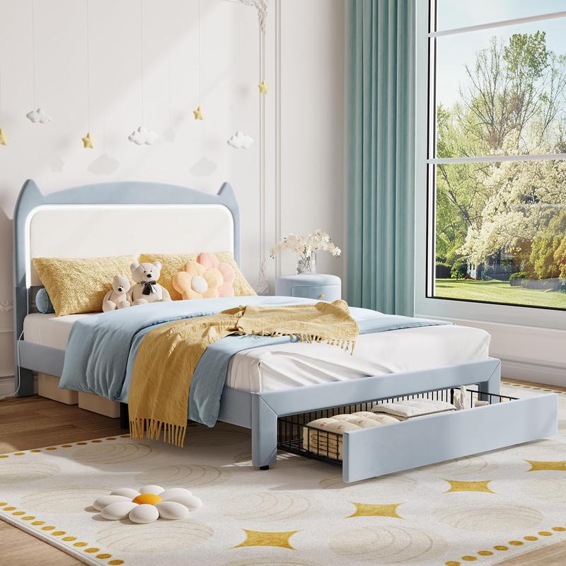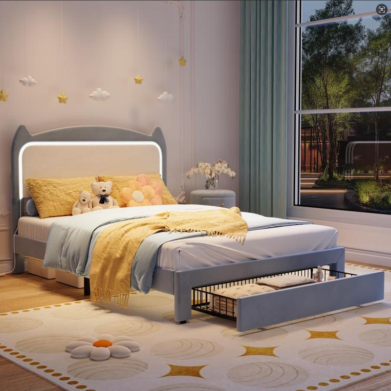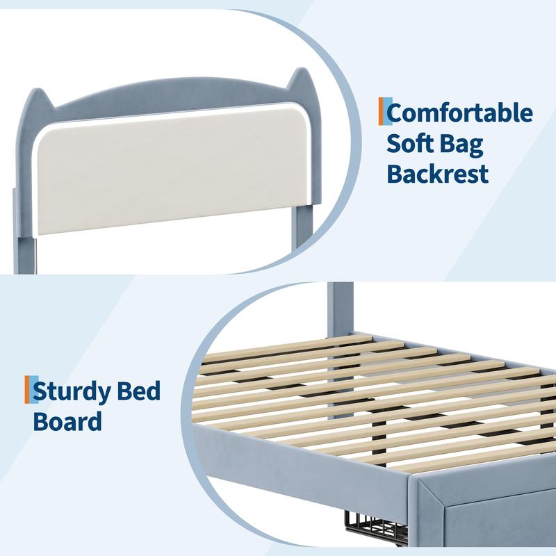 · Charming Cat Headboard Design: This platform bed frame features a whimsical cat-shaped headboard, upholstered in soft, skin-friendly velvet with plush padding for extra comfort—perfect as a princess bed frame or for any cat lover's bedroom decor