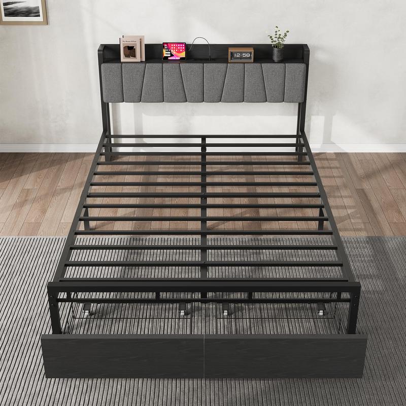 Garvee Full Size Bed Frame with 2 Storage Drawers, Industrial Full Platform Bed with Upholstered Headboard and Charging Station, No Box Spring Needed, Black