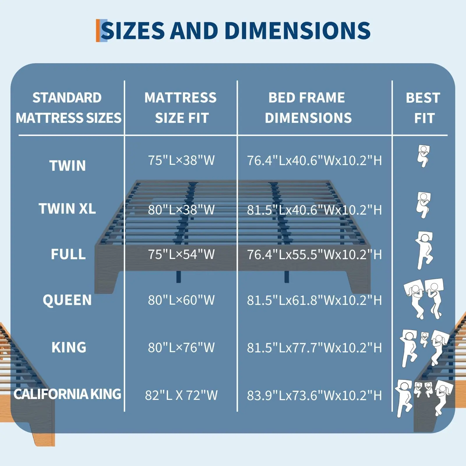 · 🛏️ Sturdy Platform Base with Reinforced Slats–No Box Spring Needed–Built with a stable engineered wood frame and strong slat support system that works with all standard mattress types (foam, hybrid, innerspring).
