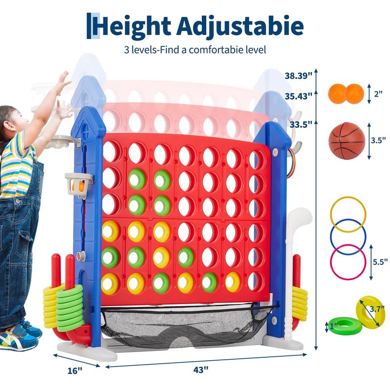 · Multi-in-one entertainment center: 4 games can be done in one set: not just 4 in a row game! The set includes: mini basketball frame (with small basketball); golf club & ball; ring throwing ring. A set of equipment meets different game needs. Family gatherings are no longer monotonous and can be played indoors and outdoors!