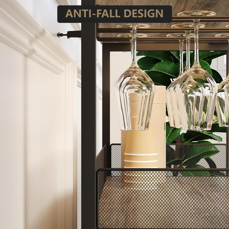 · Wine Storage & Display : Our ventilated wine rack securely holds 12-15 bottles with detachable dividers for flexible storage, while the overhead stemware rack displays up to 8 wine glasses. The perfect solution for wine enthusiasts seeking organized, accessible storage.