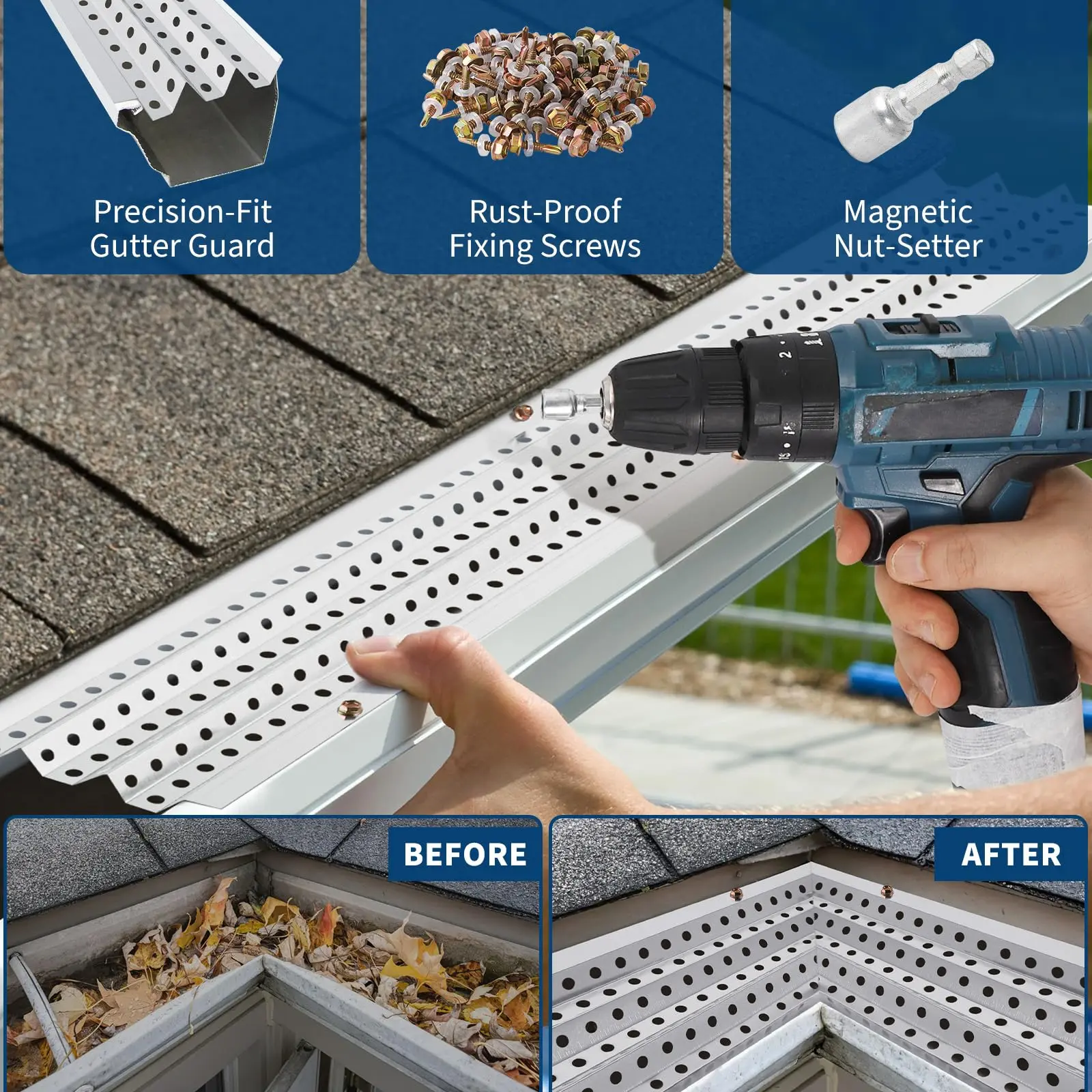 · 【Unmatched Adaptability】You can easily DIY-cut these gutter guards to fit gutters of any shape, size, or length, ensuring perfect compatibility with all gutter systems. Includes complimentary stainless steel installation screws and 1 Magnetic 1/4" nut driver for quick, efficient installation.