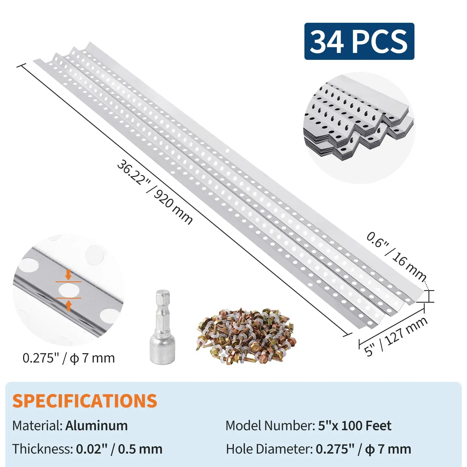 · 【Specifications】This gutter guards 5 inch width | Total length: 100 Feet | Size of each piece: 5" x 36.22" | Total pieces: 34 PCS | 36.22" x 34 PCS = 100 Feet