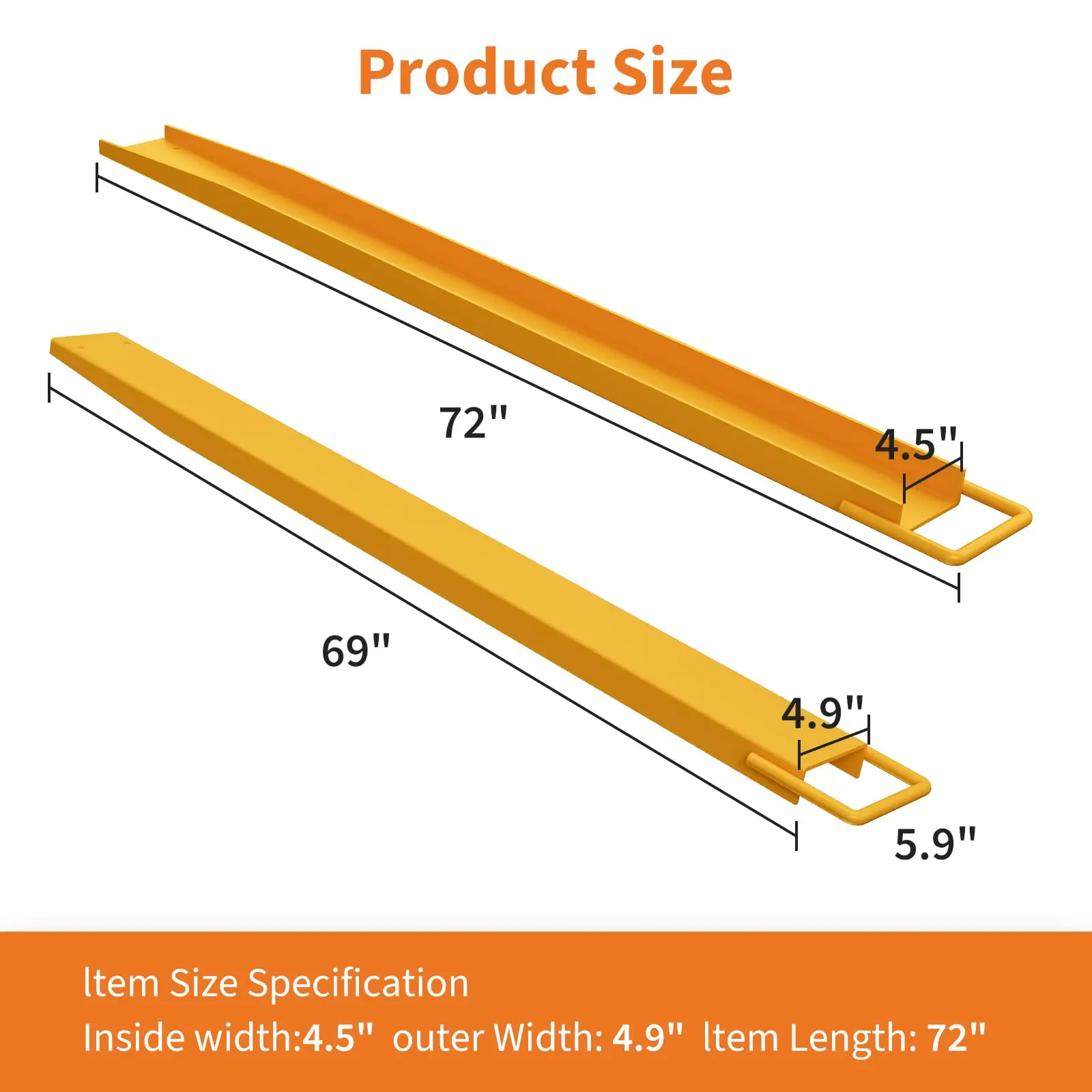 · Precision Fit for 4.3–4.5 Inch Forks: Designed with a precise 4.5-inch inner width and 96-inch length, these forklift extensions seamlessly fit standard 4.3–4.5 inch pallet forks. They effectively expand the fork surface area, enabling safer and more efficient handling of oversized, unstable, or bulky loads in warehouse and industrial settings.
