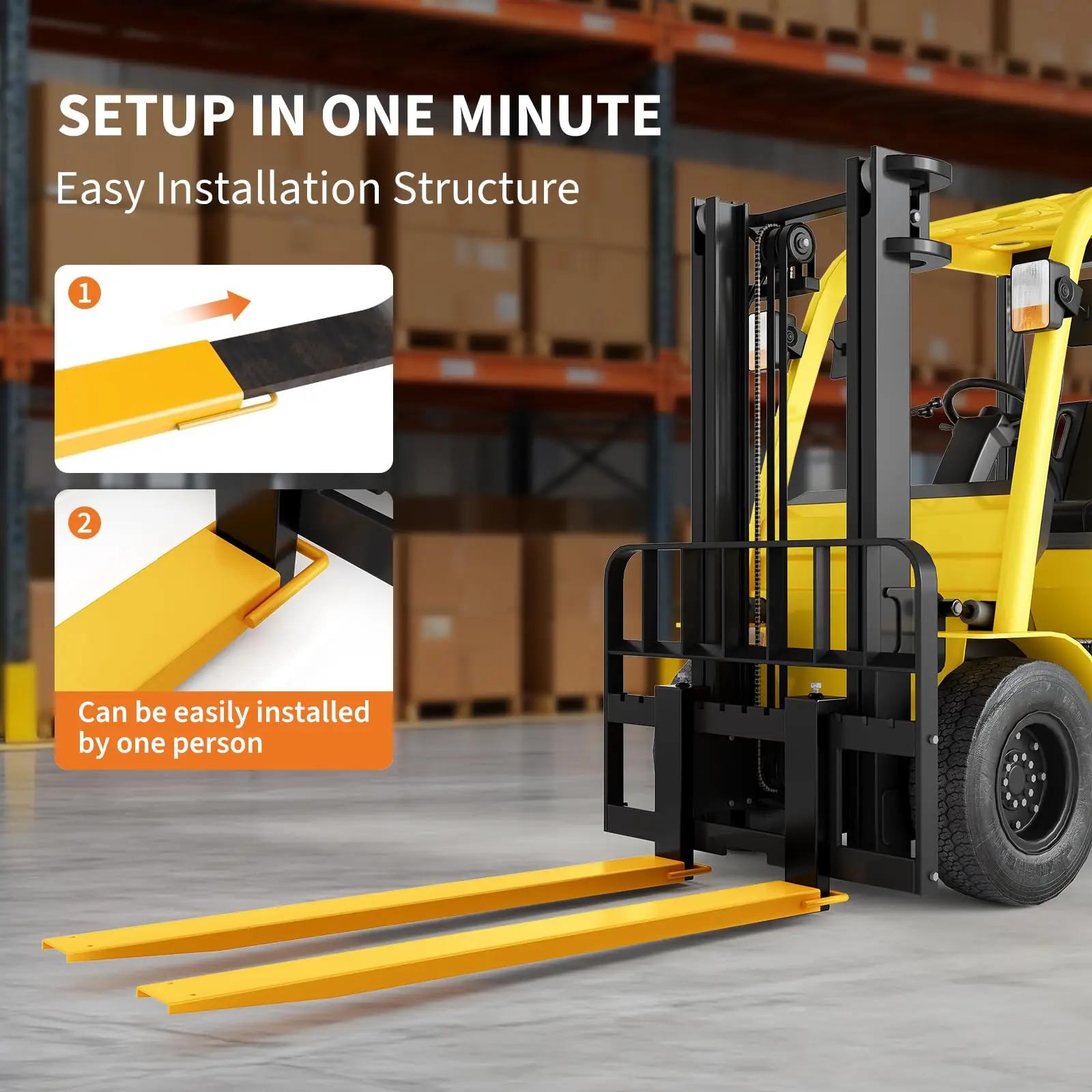 · Tool-Free Installation in Seconds: Designed for maximum efficiency, these forklift extensions can be installed or removed by a single operator without any tools. Simply align and slide them securely onto the existing forks—minimizing downtime and streamlining material handling workflows.