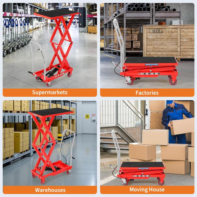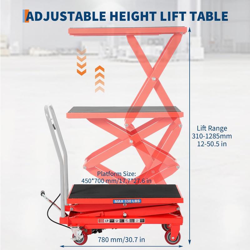 · Powerful Lifting for Big Loads: Easily lift up to 330 lbs with a robust hydraulic pump and double scissor design, featuring a 12''–50.5'' lifting range. This hydraulic table cart can move materials and heavy furniture with stable, effortless height adjustment—saving your back and time