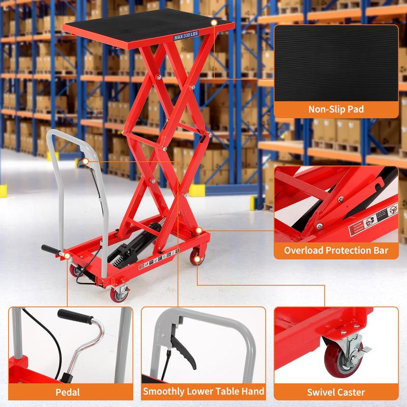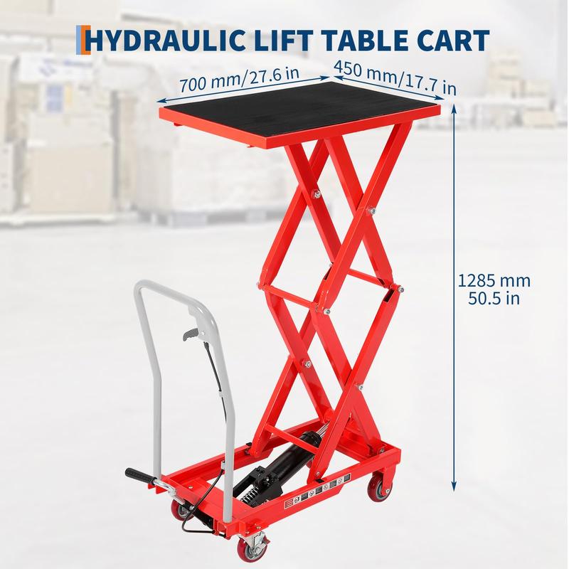· Spacious Platform Fits More: The double scissor hydraulic lift table cart with 27.6x17.7 inch platform lift offers secure, non-slip performance with ample room to safely handle boxes, equipment, or appliances—perfect as a material lift or appliance lift for confidently tackling big jobs