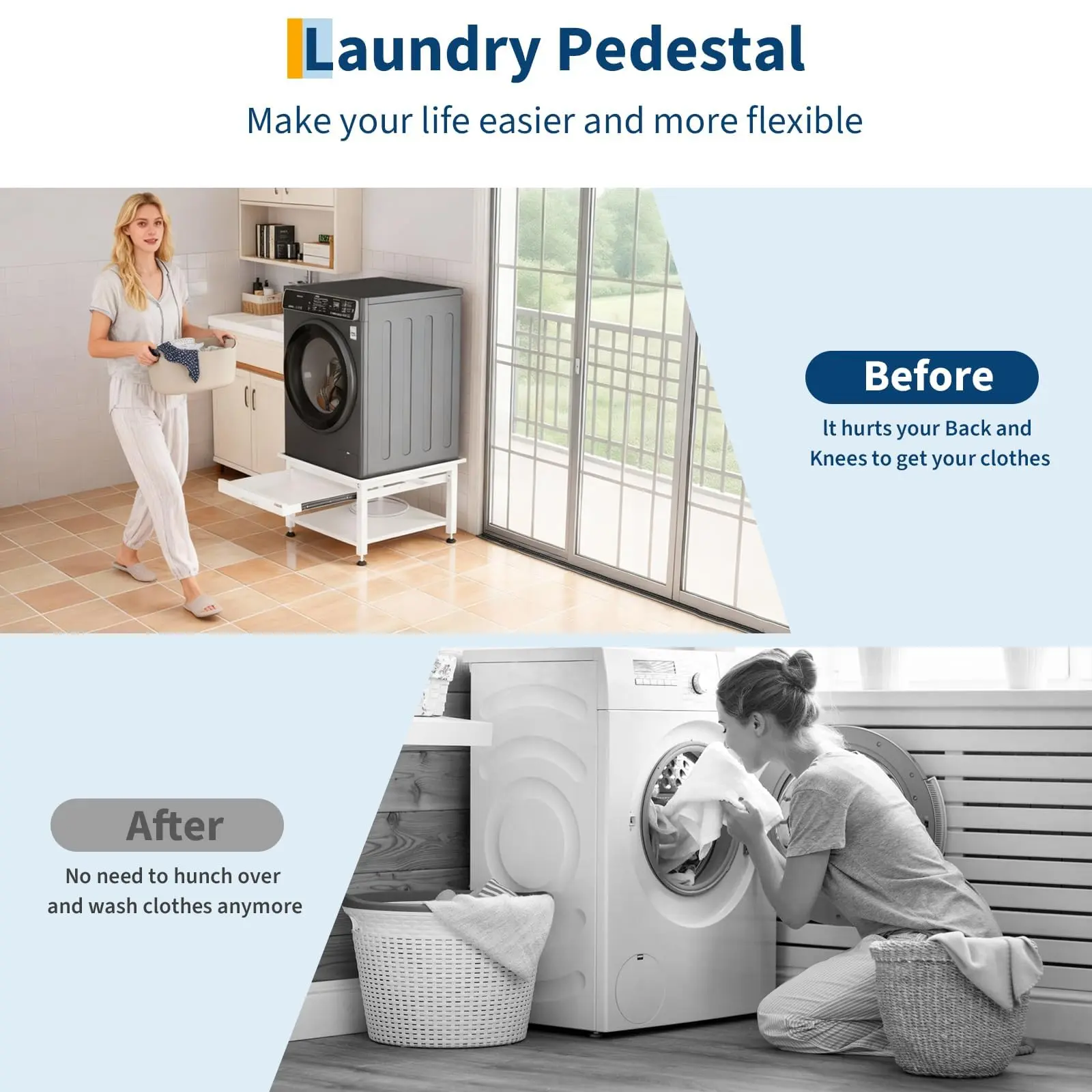 · Ergonomic Laundry Pedestal: Enhance your washer or dryer by 16'' or 21'' for easier loading and unloading, reducing back and knee strain during laundry chores.