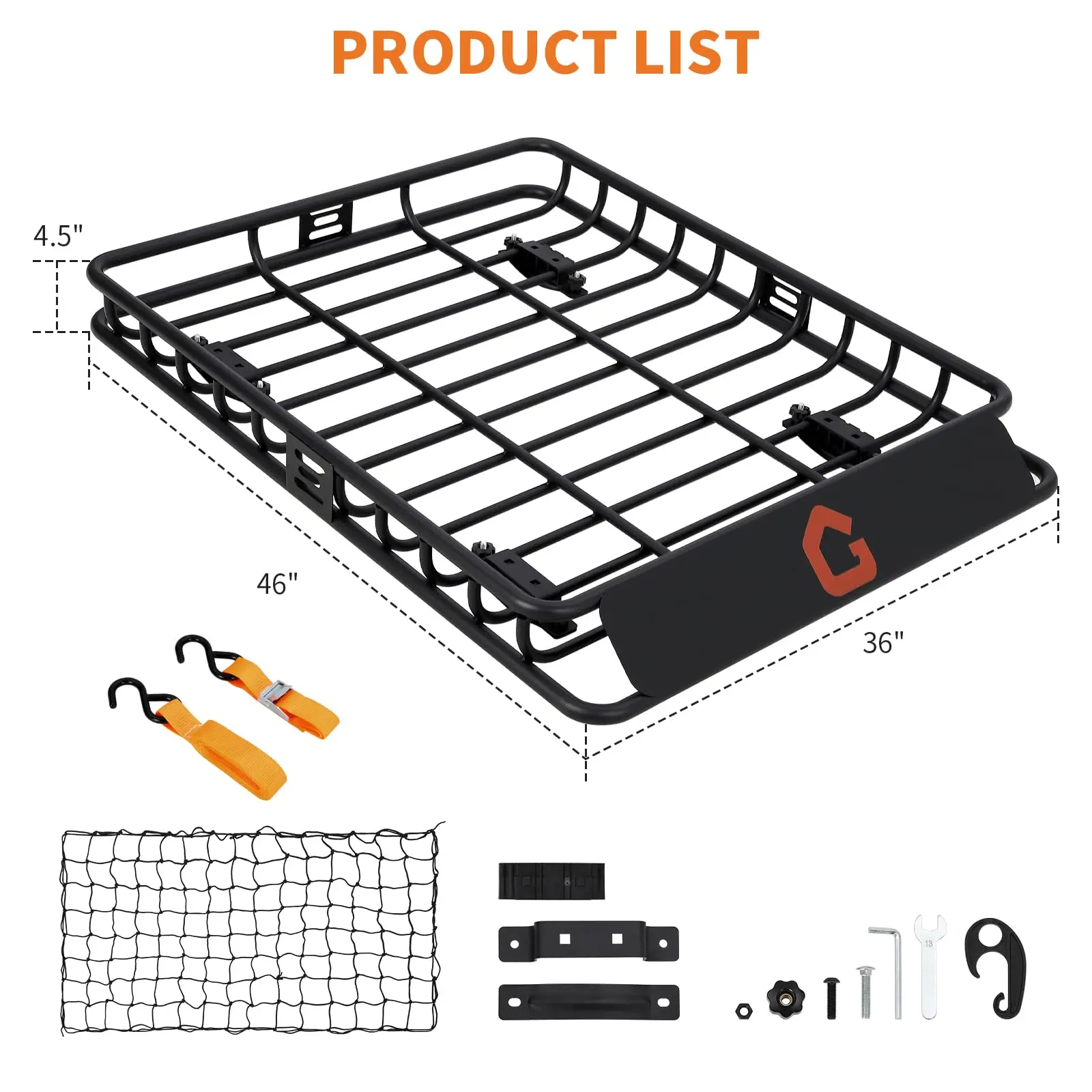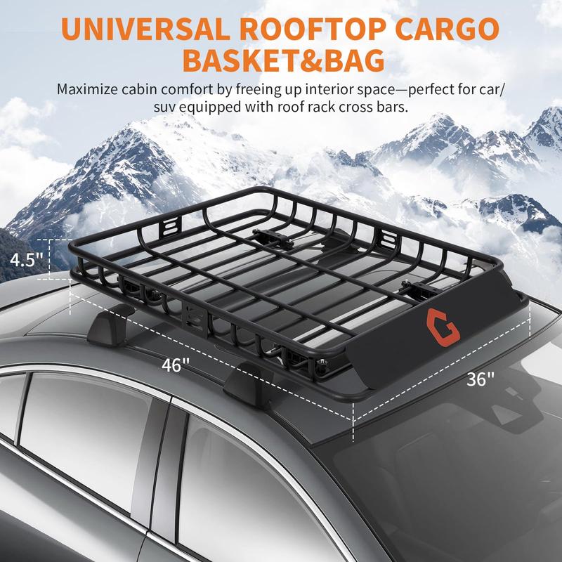 · [Spacious & Sturdy Design] Heavy-duty roof rack cargo basket is designed for maximum utility, offering a secure storage space of 46’’ (L) × 36’’ (W) × 4.5’’ (H) with a 200 lbs load capacity. Keep your vehicle interior clutter-free while confidently transporting bulky gear, sports equipment, or adventure.