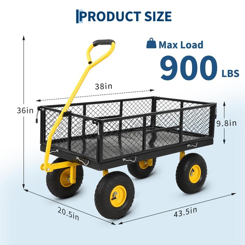 · 【900 lbs Heavy-Duty Load Capacity】Engineered for extreme workloads, this heavy duty garden cart delivers an exceptional 900 lbs load capacity – ideal for transporting soil, stone, landscaping materials, and heavy equipment in a single trip. This high capacity garden wagon eliminates repetitive hauling, transforming demanding yard work into efficient, time-saving tasks.