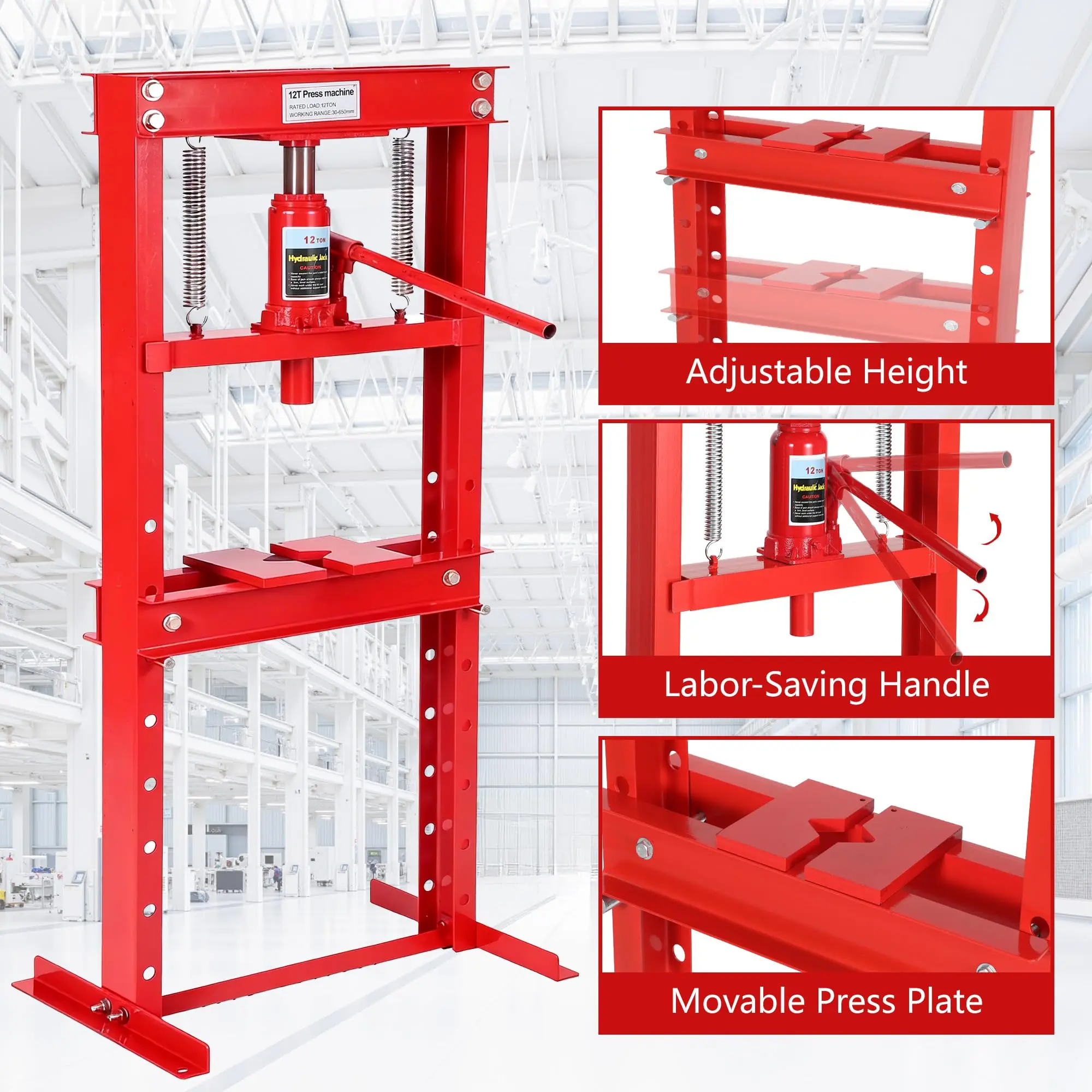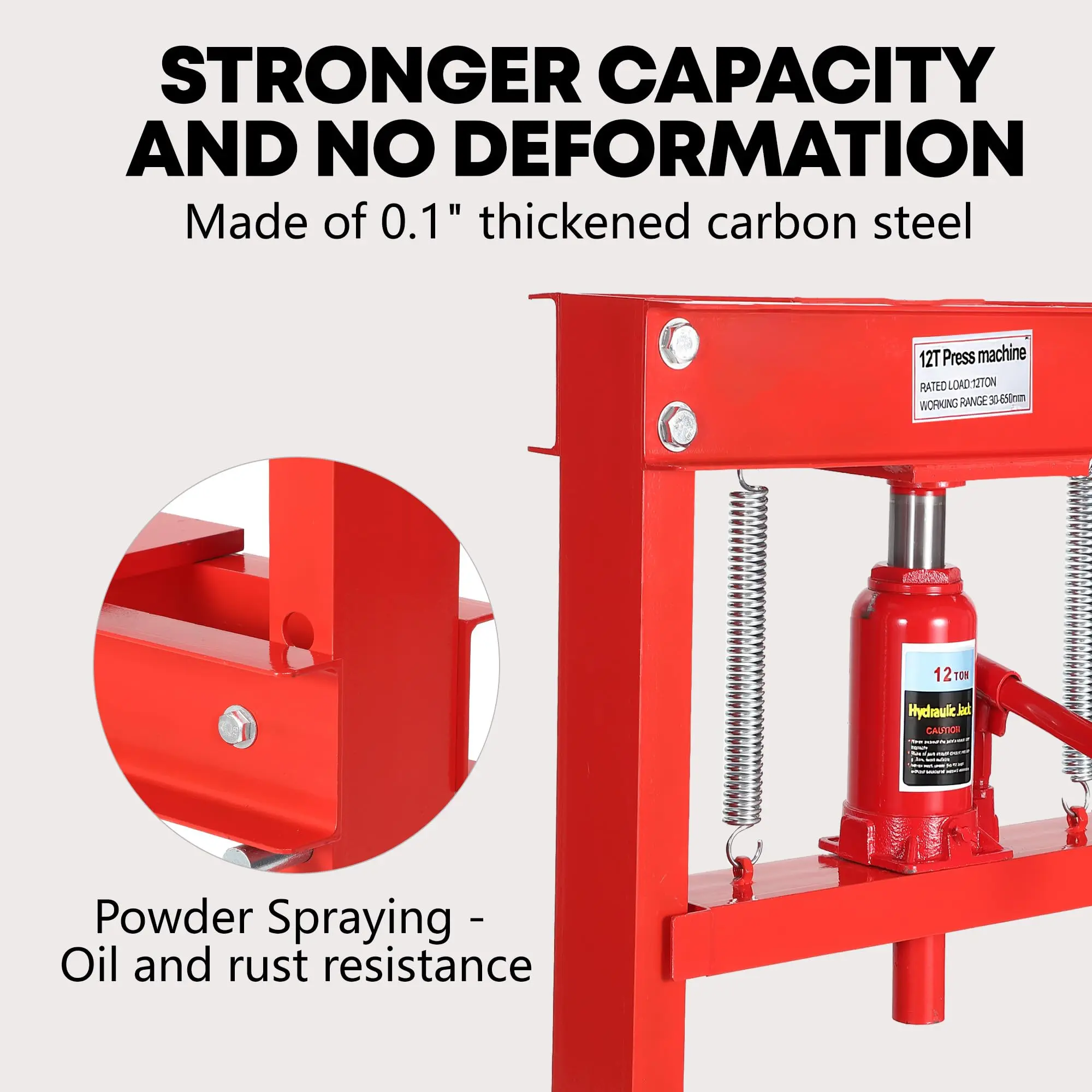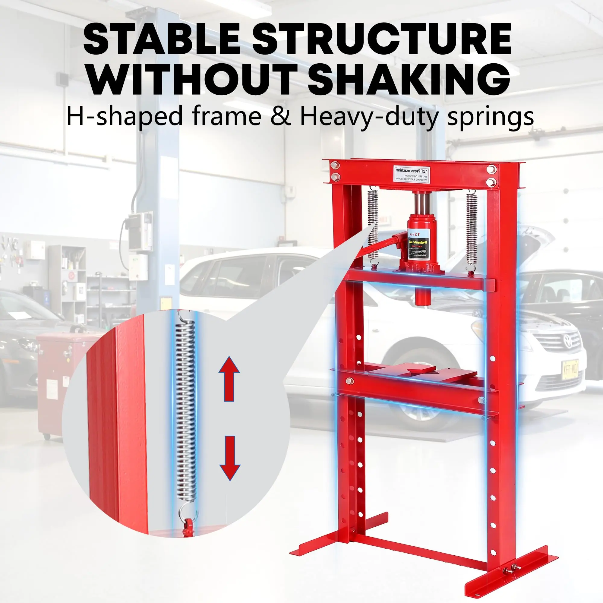 · 【Safety-First Design】 Equipped with an automatic relief valve to prevent overpressure (exceeding 12 tons) and high-precision springs for controlled rebound. The polished piston-ram resists skiving, and the H-frame steel construction eliminates wobbling during operation.