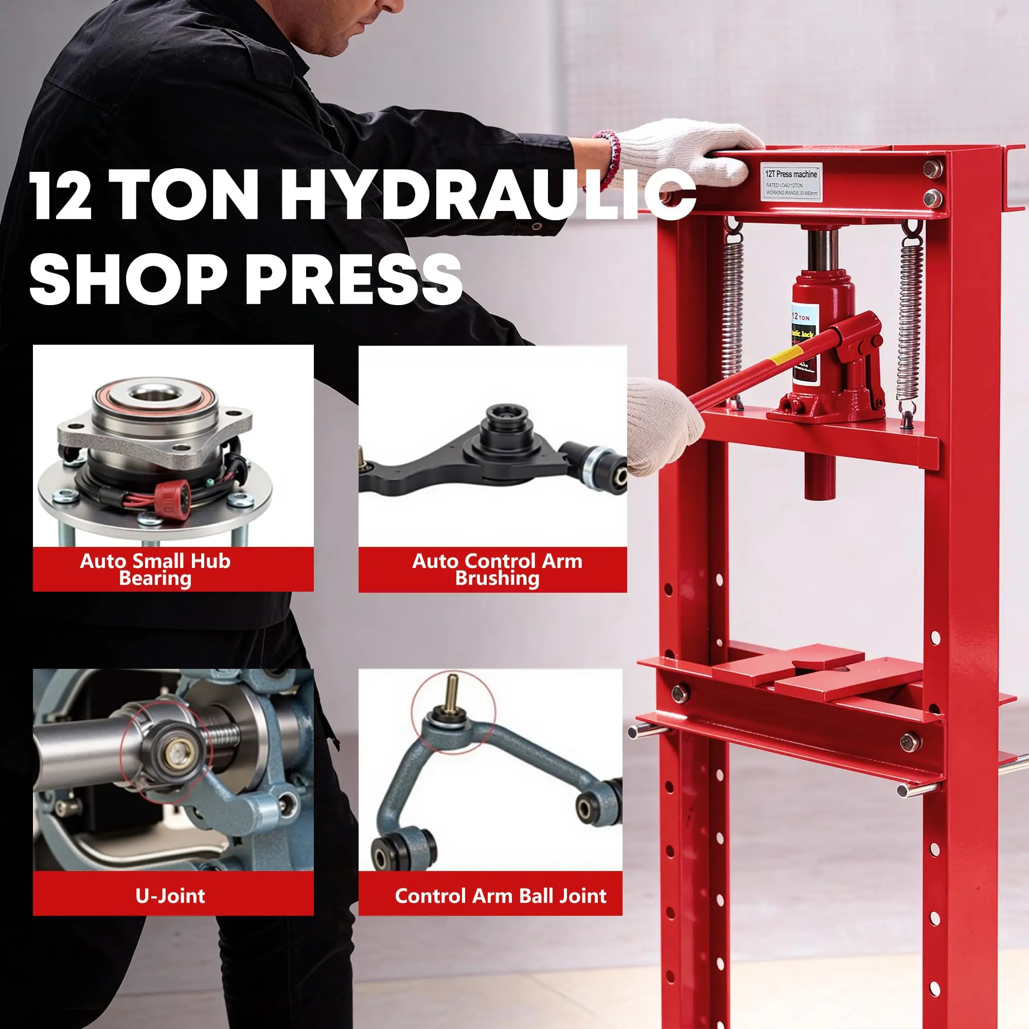 · 【12-Ton Heavy-Duty Capacity】 This hydraulic shop press delivers 12-ton pressing force, ideal for straightening metal, bending rods, installing bearings, and pressing U-joints. The included bottle jack ensures smooth operation with minimal effort, perfect for garage, auto repair, and metalworking projects.