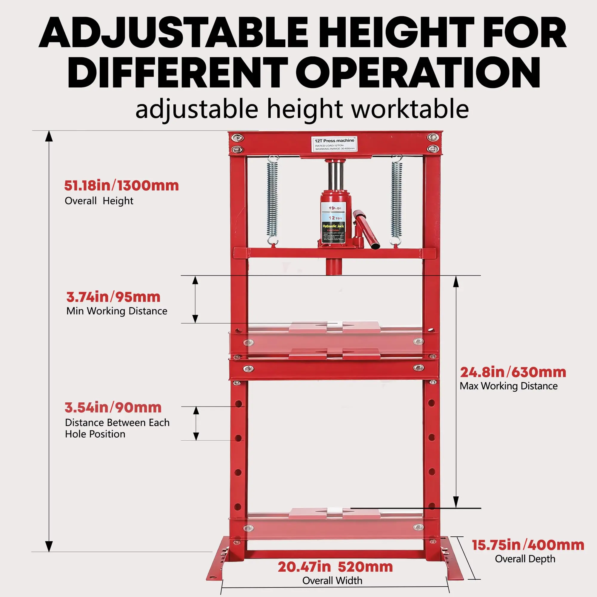 · 【Versatile & Adjustable Work Range】 Features a wide pressing range (2" to 29.5") and 4-hole adjustable worktable for customized height settings. The movable stamping plates securely handle small parts, while the pin system allows quick adjustments for diverse tasks like stamping, riveting, or bushing removal.