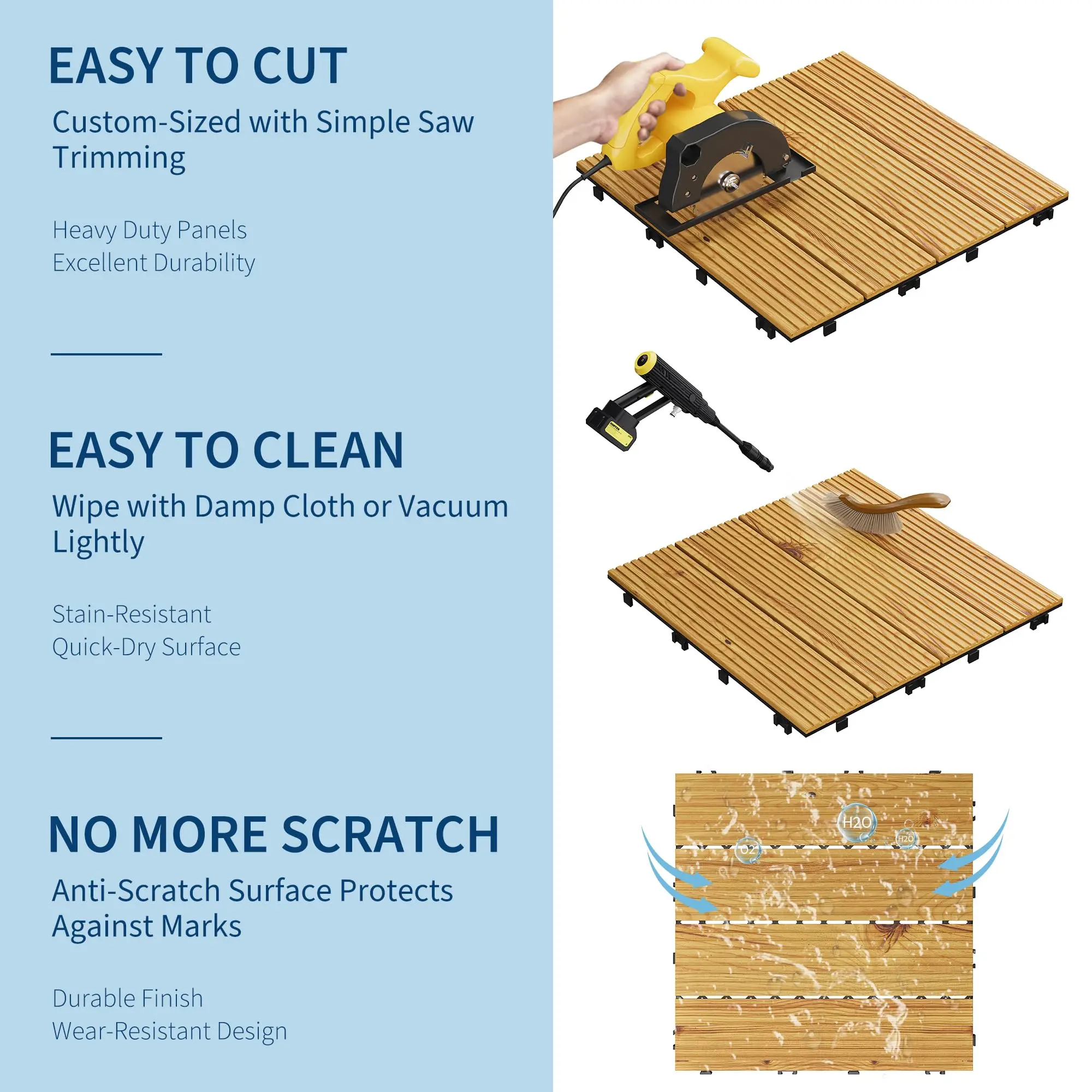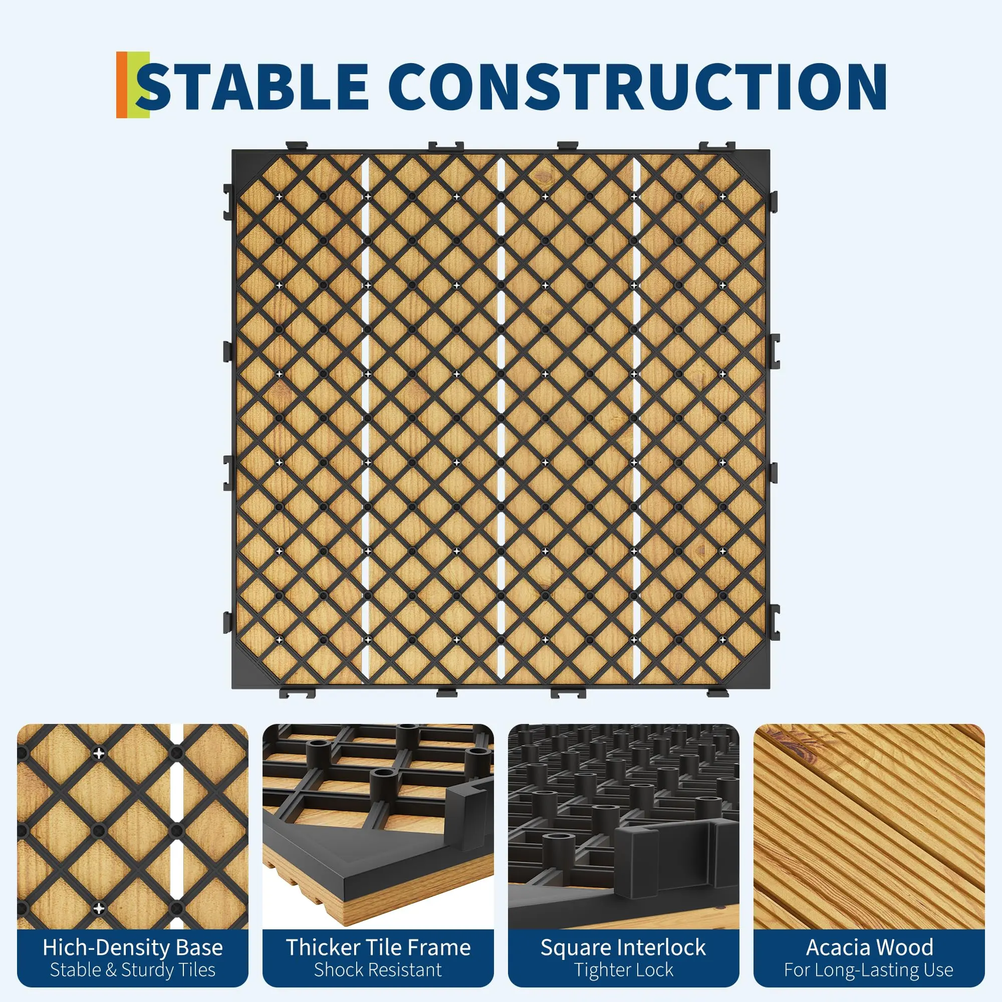 · 1,PREMIUM QUALITY MATERIALS:Each pack includes 22/33 genuine Acacia wood patio tiles (12"x12") sourced directly from Vietnam, featuring our exclusive Dual-Shield Protection System. This advanced coating technology delivers superior waterproofing and UV resistance compared to standard single-coated tiles, ensuring long-lasting beauty and durability for perfect outdoor performance. The rich wood grain and natural patterns create an elegant foundation for any space.
