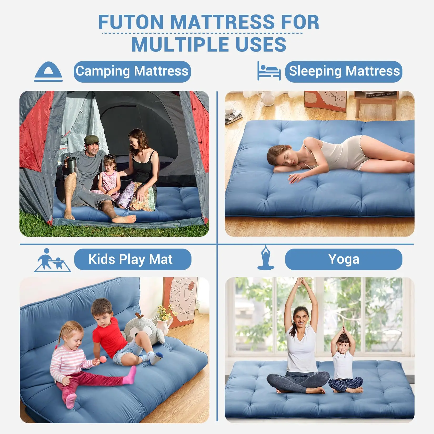 · Functional and Practical: This foam floor mattress can provide immediate comfort due to its flexibility. It is designed to be functional and practical, easily folding for storage or transport. You can use this floor mattress as a sleeping bed in your living room, bedroom, or guest room and as a kids floor play mat in play room, meanwhile, this futon mattress is also a camping mattress pad for RV travel and road trip.