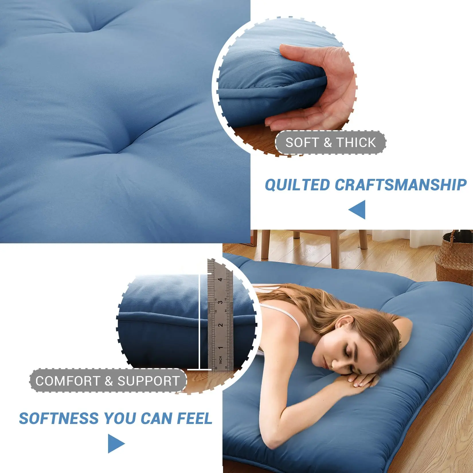 · Promote Deeper Sleep: This Japanese style futon mattress offers a medium-firm yet flexible and supportive surface that embodies ergonomic design principles. This floor mattress features 4 Inches thickness, promoting your cozy sleeping experience, which helps create a serene environment conducive to relaxation and stress relief.