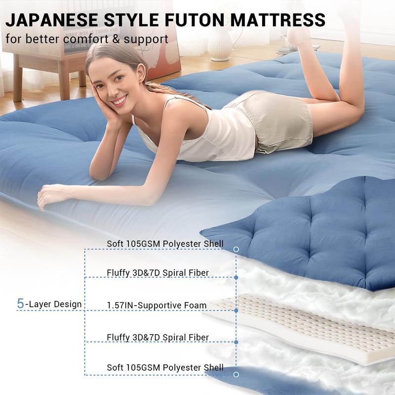 · 5-Layer Futon Mattress Structure: Made of two layers of fluffy cotton fiber with 1.57 Inch high-density supportive foam at the core, you will feel soft and comfortable while sitting and sleeping. Soft premium polyester cover with elegantly quilted pattern, this floor mattress will suitable for your home style and simplify your life.