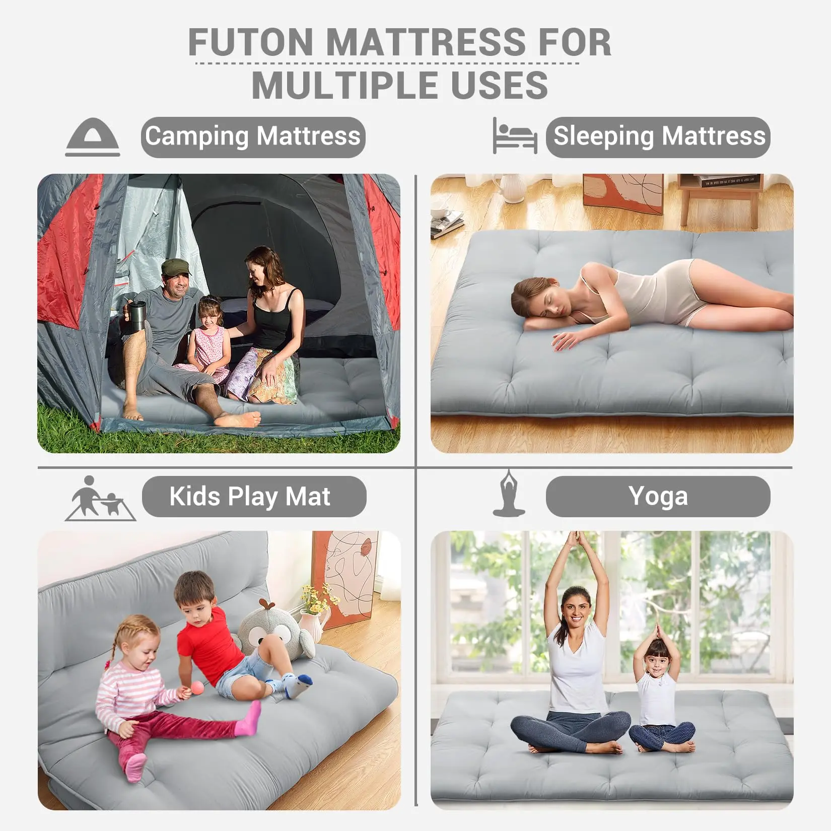 · Functional and Practical: This foam floor mattress can provide immediate comfort due to its flexibility. It is designed to be functional and practical, easily folding for storage or transport. You can use this floor mattress as a sleeping bed in your living room, bedroom, or guest room and as a kids floor play mat in play room, meanwhile, this futon mattress is also a camping mattress pad for RV travel and road trip.